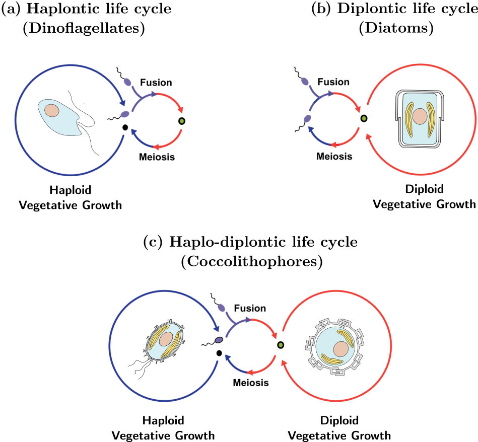 석회비늘편모류의 복잡한 일생은 단복상 생활환이라고 부르며, 무성 단계와 유성 단계가 반복해서 나타난다. 무성 단계는 홑배수체 단계, 유성 단계는 두배수체 단계이다. 홑배수체 단계에서 석회비늘편모류는 체세포분열을 통해 번식하며, 이 과정에서 생겨난 세포는 더 분열하거나 다른 홑배수체 단계의 세포와 유성생식한다. 두배수체 세포가 생겨나면 감수분열을 통해 다시 홑배수체 세포를 만든다. 석회비늘편모류는 다른 생물과 달리 두 단계 모두에서 무성생식이 가능하다.[189][74] 이 과정은 비생물적 요인과 생물적 요인에 따라 달라질 수 있다.[158][43]