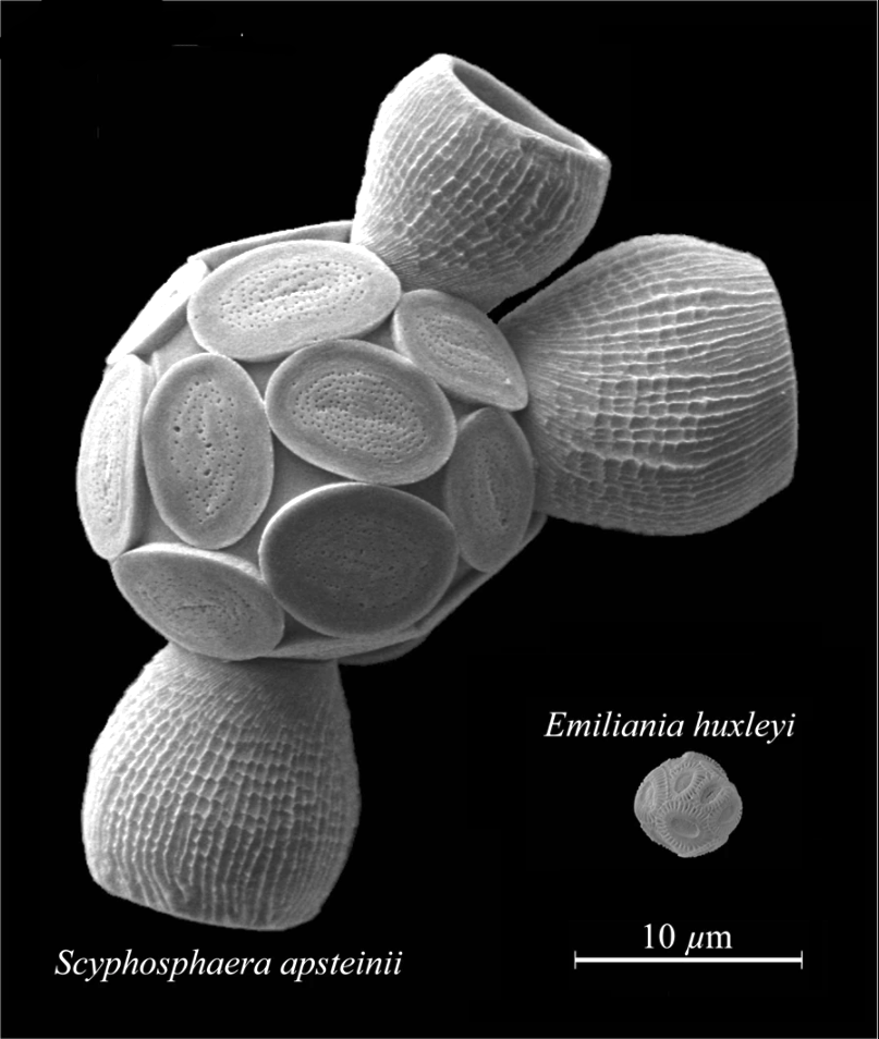 석회비늘편모류는 대부분 혼자 떠다니는 형태로 관찰된다.[160] 플랑크톤의 일종으로, 로버트 휘태커의 생물 분류에 따르면 원생생물계에 속하며, 새로운 분류 체계에서는 Hacrobia에 속한다. 이들은 'coccolith'라고 불리는 탄산 칼슘 판으로 구별된다. 많은 종이 혼합 영양생물로, 광합성과 먹이 섭취를 병행한다.[15]석회비늘편모류는 쥐라기 시대부터 해양 플랑크톤 군집의 중요한 구성원이었으며,[16][17] 오늘날에는 표층 해양의 무기 탄소 고정과 CaCO3 퇴적에 기여한다. 석회질 껍질은 CO가 심해로 가라앉는 속도를 높이는 반면,[20][21] 석회비늘 형성 과정에서 생물 기원 탄산 칼슘 침전은 해수의 알칼리도를 낮추고 CO를 방출한다.[22][23] 따라서 이들은 해양 탄소 순환에 중요한 역할을 수행한다.[1]