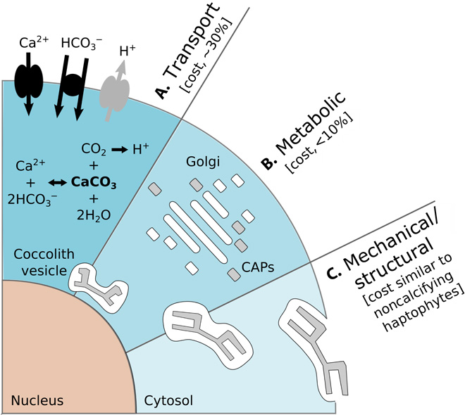 탄산칼슘 내의 방해석은 코콜리스가 흡수하는 빛보다 더 많은 빛을 산란시키게 한다. 이는 두 가지 중요한 결과를 낳는다.