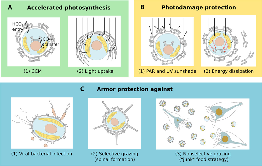 석회비늘편모류의 코코스피어(coccosphere)는 포식자나 바이러스로부터 보호하는 역할을 하는 것으로 보인다.[29][27]