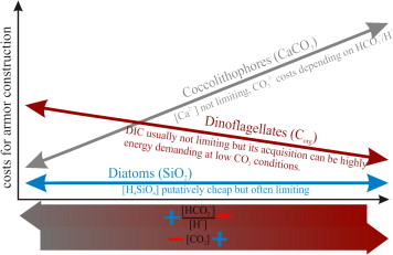 석회비늘편모류는 생물학적 탄소 펌프의 효율과 대기 중 이산화탄소의 해양 흡수에 영향을 미침으로써 해양 탄소 순환에서 중요한 역할을 한다.[1] 석회질 껍질은 광합성으로 고정된 CO2영어가 심해로 가라앉는 속도를 증가시킨다.[20][21] 동시에, 석회비늘 형성 동안 생물 기원 탄산 칼슘 침전은 해수의 총 알칼리도를 감소시키고 CO2영어를 방출한다.[22][23]