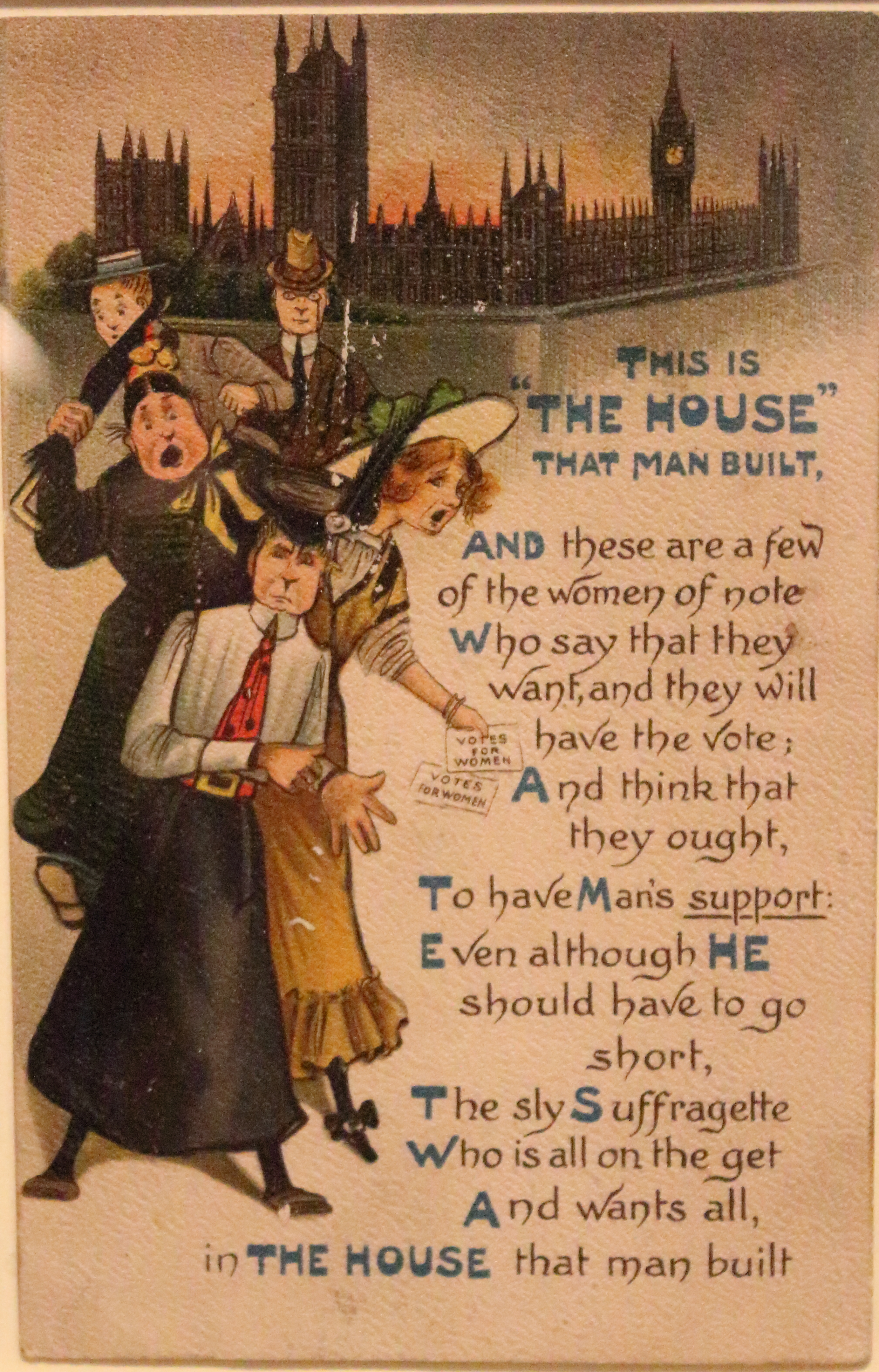 많은 여성 참정권 반대 선전은 정치에 참여하는 여성에 대한 생각을 조롱했다. 정치 만화는 여성 참정권 문제를 남성의 삶과 바꾼 모습을 묘사하여 가장 큰 정서를 드러냈다. 어떤 만화는 당시 유행했던 참정권 운동가의 헤어스타일(머리카락을 위로 빗어 올리는)을 조롱했다. 다른 만화는 결혼에 실패하는 등 인생에서 실패한 어린 소녀들이 참정권 운동가가 되는 모습을 묘사했다.[23]