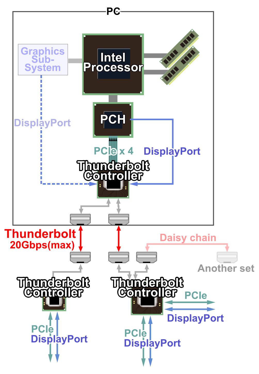 선더볼트 컨트롤러는 하나 이상의 PCIe와 디스플레이 포트 데이터를 다중화시켜 이중 선더볼트로 전달하고, 다른 쪽에서 PCIe와 디스플레이 포트 기기를 위해 역다중화시킨다.[203] 선더볼트 포트 하나는 허브나 데이지 체인을 통해 선더볼트 기기 여섯 개까지 지원한다. 미니 디스플레이포트가 하나 달린 모니터나 다른 기기들은 체인 가장 끝에 연결되어야 한다.