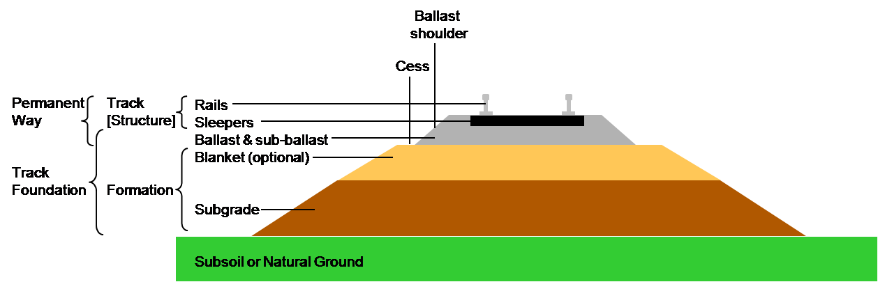 일반적으로 선로는 철도 차량 주행에 필요한 설비를 포괄하며, 터널, 신호, 표지 등의 보안 설비, 각종 통신 설비, 정거장인 역 등의 설비도 포함한다. 선로 도상을 지지하는 노반 표면은 '''시공 기면'''이라고 하며, 궤도는 이 시공 기면 위에 설치된다.[62]
