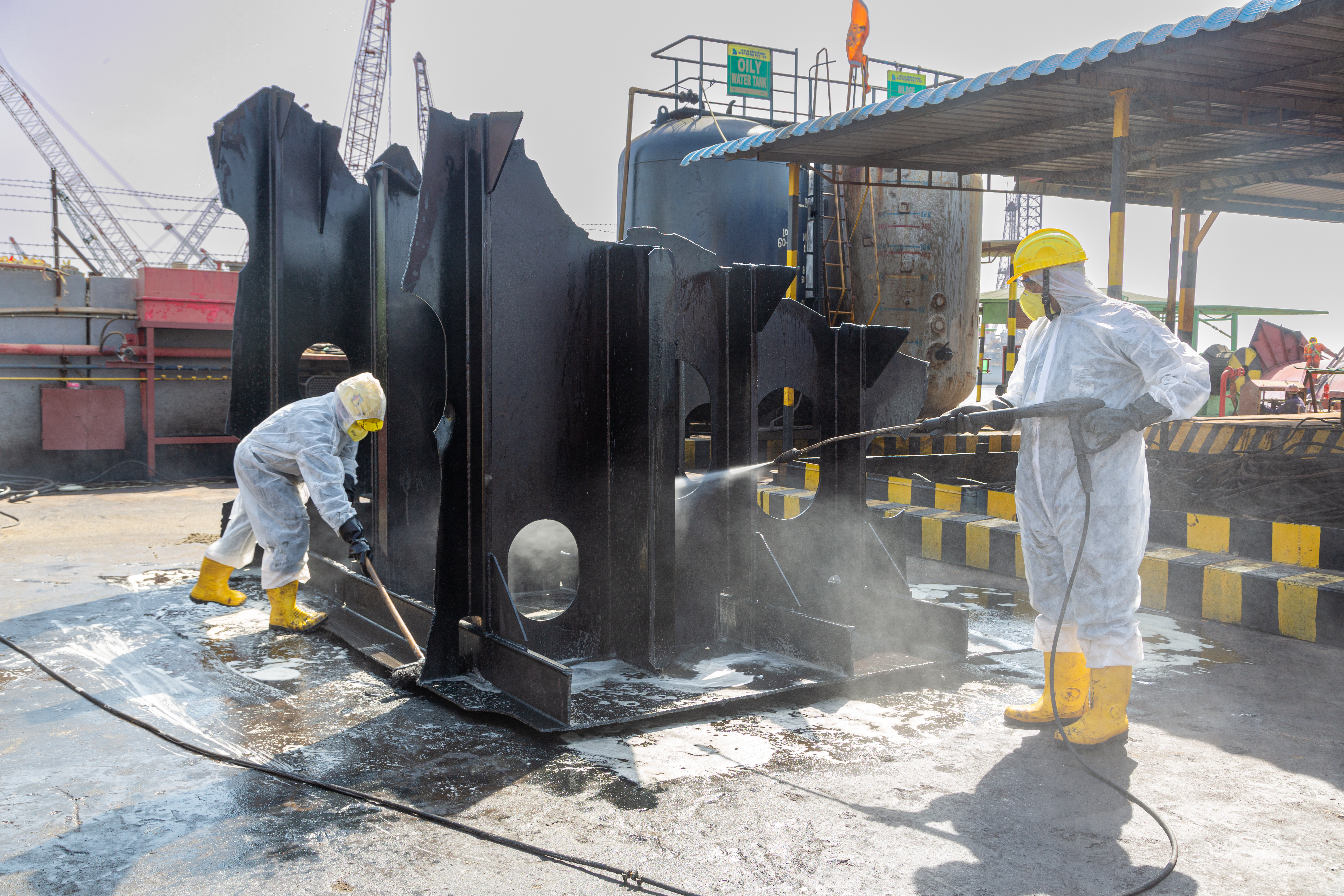• 인도 알랑의 불침투성 바닥에서 재활용 선박의 기름때 묻은 부분을 청소하는 모습