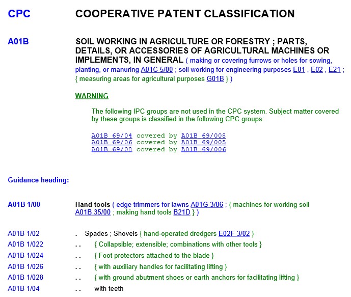 CPC 체계에는 CPC 정의 세트가 함께 제공된다.[4] CPC 정의는 CPC 체계를 특정 기술 분류 및 검색에 사용하는 방법을 설명하는 문서다. A01B 체계와 관련된 CPC 정의의 일부가 두 번째 그림에 나와 있다.