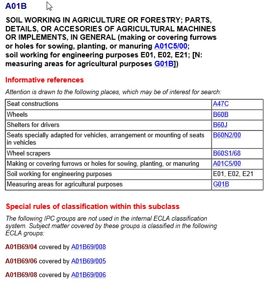 • 서브클래스: 한 글자 (A01B는 "일반적으로 농업 또는 임업의 토양 작업, 농업 기계 또는 도구의 부품, 세부 사항 또는 액세서리")