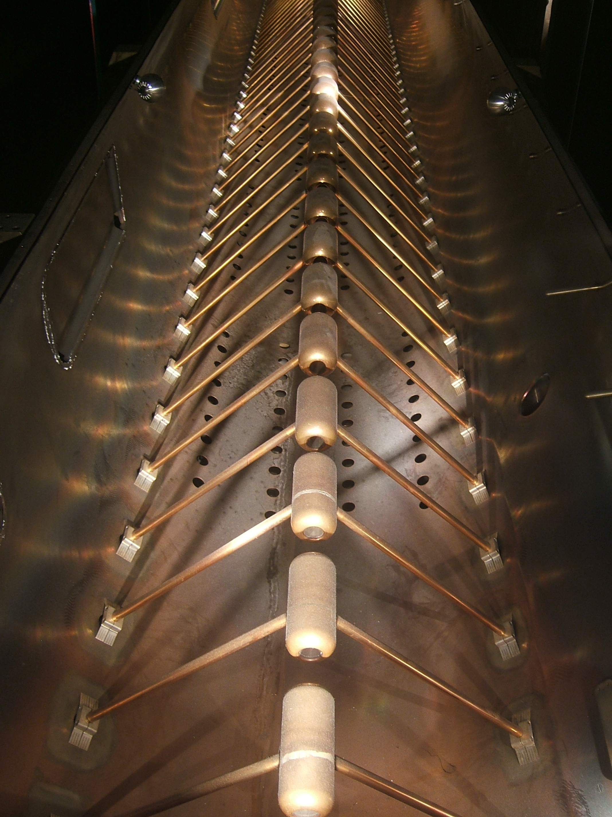 - 원통형 전극: 소스에서부터 파이프를 따라 뻗어 있는 일련의 열린 원통형 전극들(C1, C2, C3, C4)로, 소스에서 멀어질수록 길이가 점차 증가한다. 전극의 길이는 구동 전원의 주파수와 전력, 가속될 입자에 의해 결정된다. 입자의 질량은 원통형 전극의 길이에 큰 영향을 미치는데, 예를 들어 전자는 양성자보다 훨씬 가볍기 때문에 일반적으로 매우 빠르게 가속되므로 훨씬 작은 단면의 원통형 전극이 필요하다.