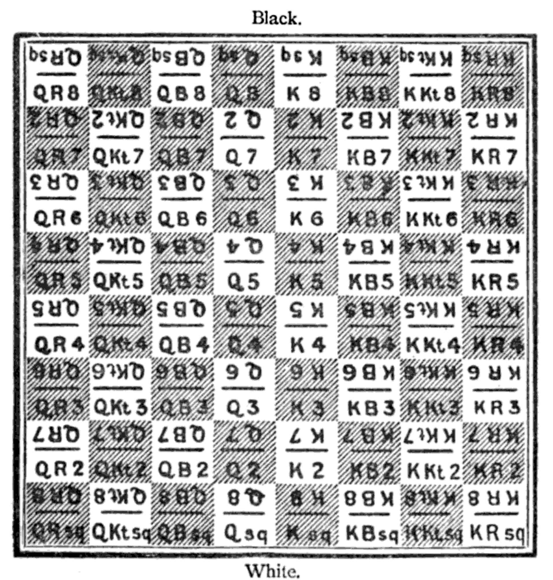 칸에 이름을 지정하는 이 방법은 각 칸이 백의 관점에서 하나의 이름과 흑의 관점에서 다른 이름을 갖는다는 것을 의미한다.