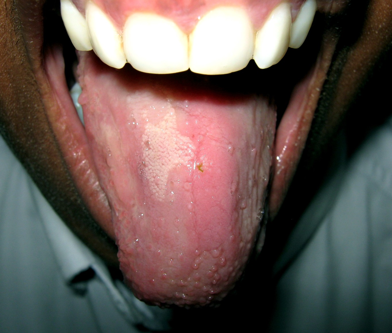 - 혀 피어싱[10] (장신구에 의한 지속적인 자극과 칸디다 알비칸스 집락 형성에 의해 발생)[11]