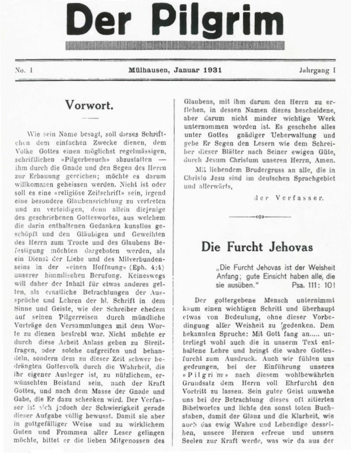 1928년, 워치타워 협회의 전 지부장인 콘라드 C. 빙켈레는 독일, 오스트리아, 스위스에서 자유 성경 연구생 협회를 설립하고, 1931년부터 1934년까지 ''데어 필그림''이라는 종교 잡지를 발행했다.