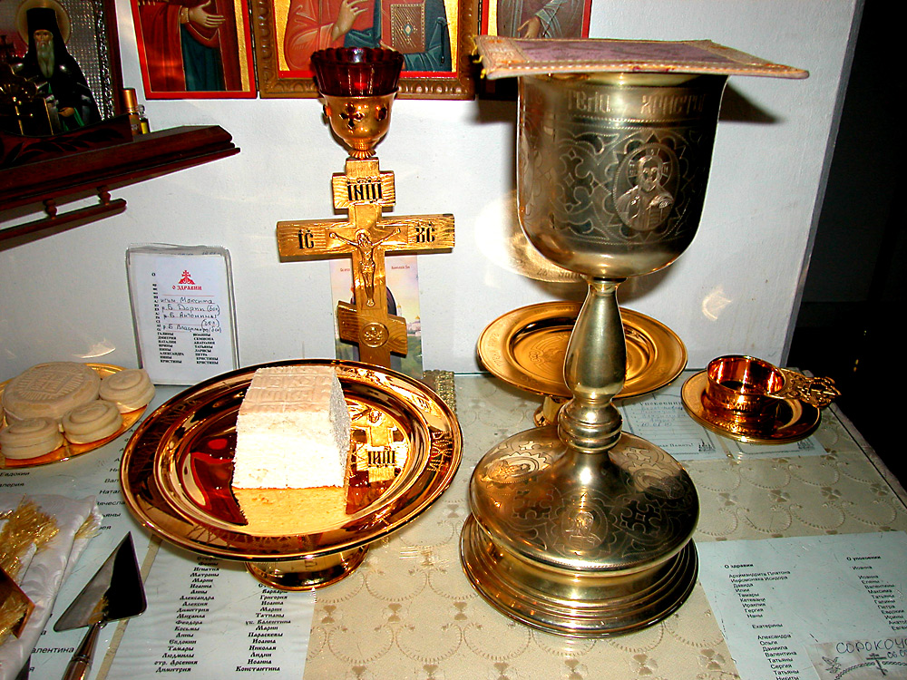 봉헌물로 사용되는 빵과 포도주는 신자들이 가져온다. 빵은 하느님께 바치는 봉헌물로, 누룩이 들어간 빵에 '예수 그리스도께서는 승리하신다'는 뜻의 '이에수스 크리스토스 니카(IC XC NIKA)' 직인을 찍는다. 이 직인이 찍힌 부분은 어린양, 즉 예수의 몸을 나타낸다. 이 빵은 예수가 최후의 만찬에서 사용했던 누룩이 든 빵으로, 아르토스라고 불린다. 사제는 이 부분을 표창으로 잘라내 제대 한가운데 놓는다. 제대 위에 놓이는 빵의 위치와 각 빵이 상징하는 바는 다음과 같다.