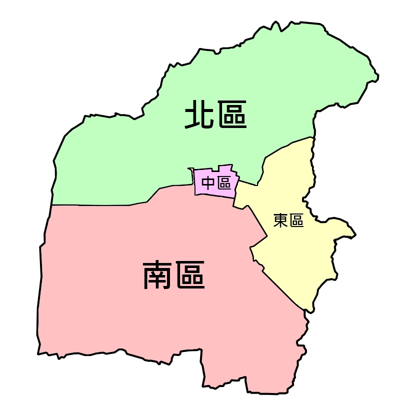 백화자면적 시청 소재지 설립 자이시 자이 시/嘉義市zh-tw Jiāyì Chia¹-i⁴ Jiayì Ka-gī Kâ-ngi 60.03 km2 동구 동구/東區zh-hant 1982-07-01 신주시 신주 시/新竹市zh-tw Xīnzhú Hsin¹-chu² Sinjhú Sin-tek Sîn-chuk 104.10 km2 북구 북구/北區zh-hant 1982-07-01 지룽시 지룽 시/基隆市zh-tw Jīlóng Chi¹-lung² Jilóng Ke-lâng Kî-lùng 132.76 km2 중정구 중정구/中正區zh-hant 1945-10-25