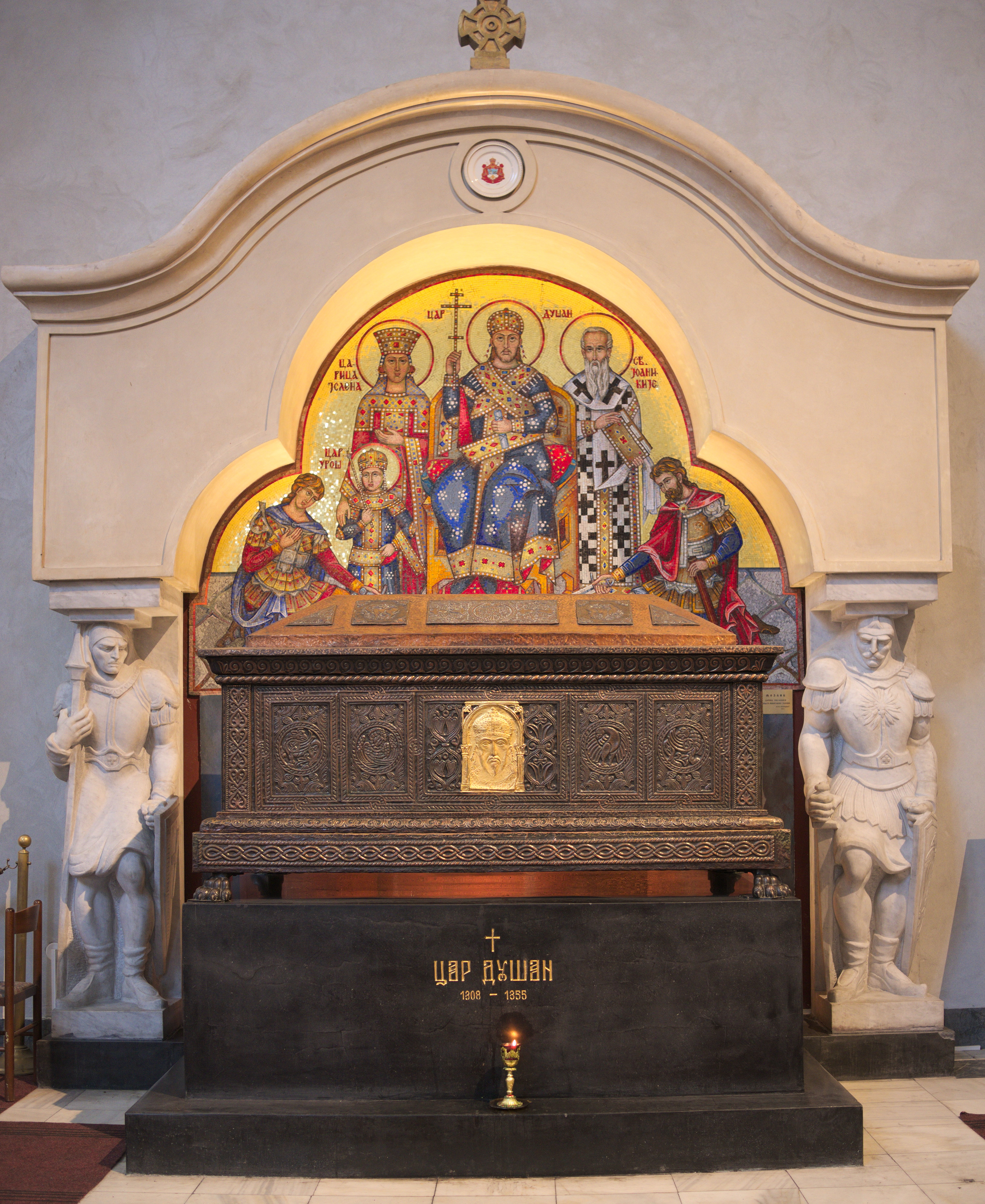 황제 스테판 두샨의 대리석 무덤은 교회 남쪽에 있으며, 드라가미르 타디치가 디자인했다. 반대편 북쪽에는 세르비아 총대주교 게르만의 무덤이 있다.[2][8] 황제와 총대주교의 무덤 위에는 Đuro Radlević가 제작한 모자이크가 있는데, 각각 "두샨 황제의 대관식"과 "섭리의 눈"이다.[10]