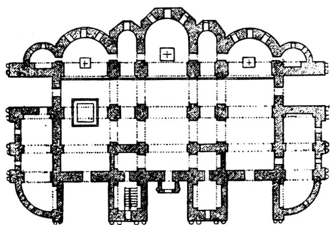 수도원의 주요 건물 4개는 돔형 대성당, 식당, 호텔 숙소(원래 1858년에 건축), 그리고 수장 숙소(1857년에 처음 건축)였다. 11세기 교회는 대성당의 중심부가 된 곳에 위치해 있었고, 원래 단일 돔이 위치해 있었다. 작은 교회, 아마도 세례당일 가능성이 있는 건물이 대성당 남쪽에 인접해 있었을 것이다. 대성당과 마찬가지로 세례당도 돔으로 덮여 있었을 수 있다.