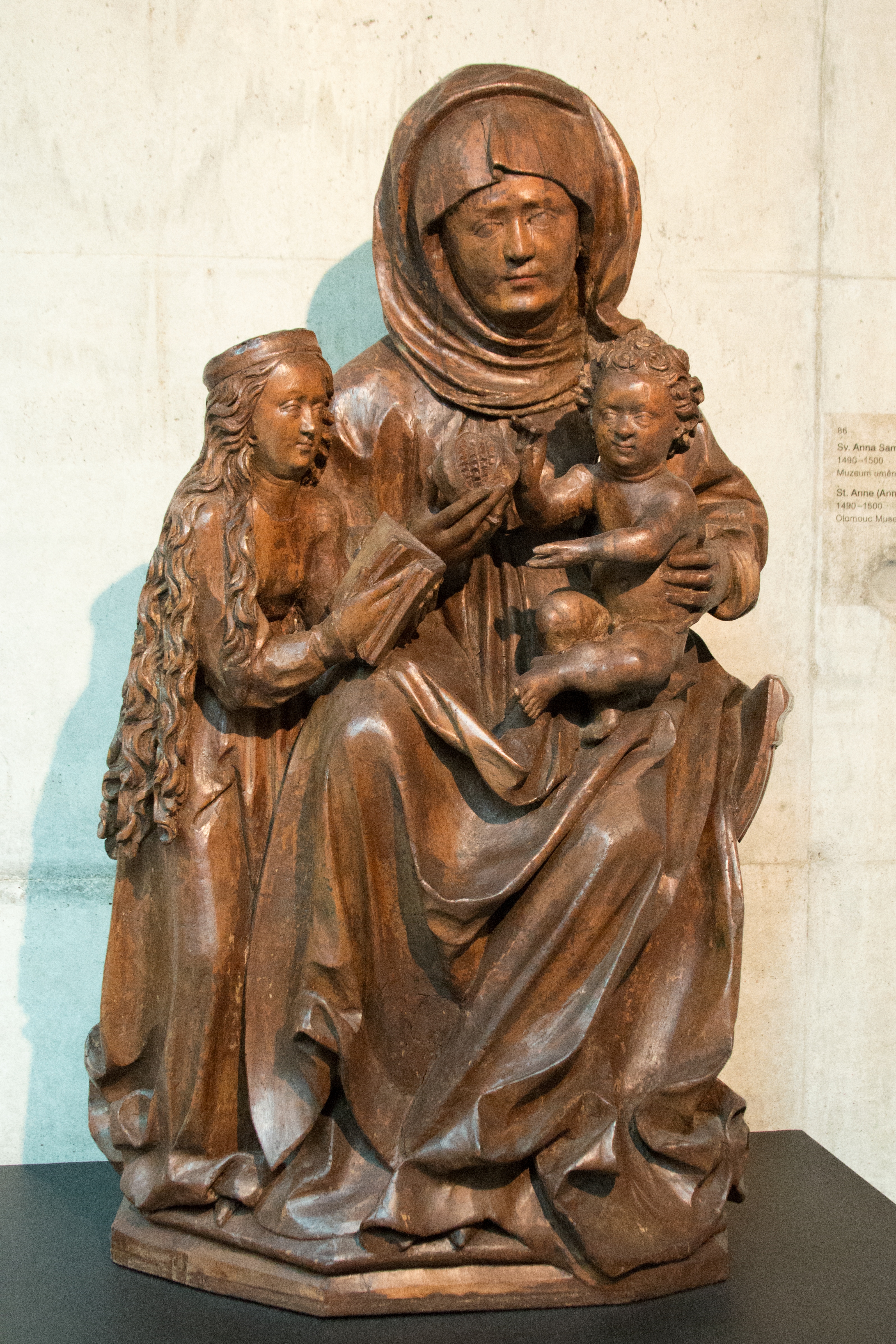 14세기 성 안나와 성모자상은 종종 초기 지혜의 보좌 도상을 모델로 삼았다. 마리아는 종종 어머니보다 훨씬 작은 모습으로 묘사되었다. 14세기에 성 안나에 대한 신심이 발전하면서 때때로 성모자와 아기 예수 조각상에 성 안나의 인물이 추가되기도 했다.[14] 안나의 전통적인 색상은 녹색과 빨간색이지만, 종종 나이든 여성의 좀 더 차분한 색상을 착용한 모습으로 묘사된다.