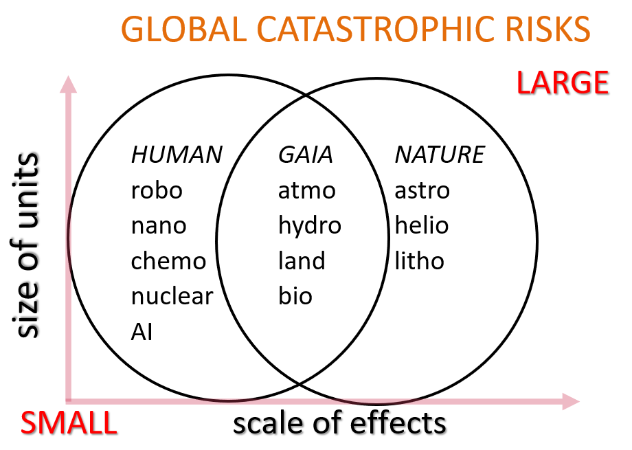 잠재적인 세계적 대재앙 위험은 크게 인위적 요인과 비인위적 요인으로 나눌 수 있다.[20]