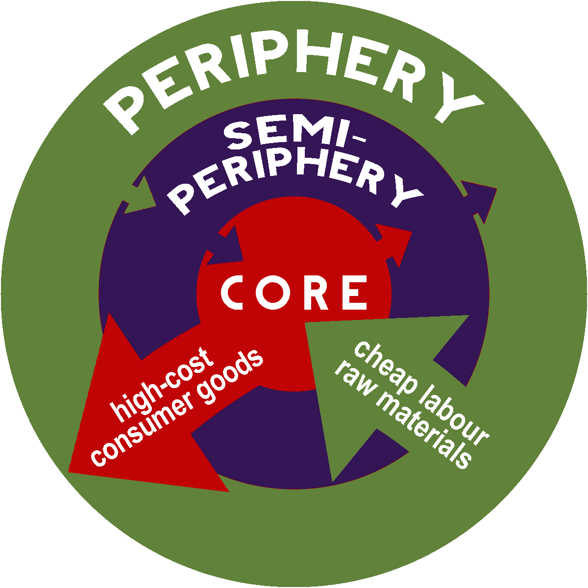 이매뉴얼 월러스틴에 따르면 세계 체제는 잉여 가치를 주변부에서 핵심으로 재분배하는 일련의 메커니즘으로 특징지어진다. 여기서 '핵심'은 선진 산업화된 세계의 일부이고, '주변부'는 전형적으로 원자재를 수출하는 가난한 세계이며, '시장'은 핵심이 주변부를 착취하는 수단이다. 지식 경제와 금융은 이제 핵심 국가에서 산업을 지배하고 제조업은 반주변부와 주변부로 이동했다.[97] 기술은 국가를 핵심, 반주변부, 주변부로 배치하는 데 결정적인 요소가 되었다.[98] 월러스틴은 가난한 국가들이 더 나은 경제 개발로 나아갈 여지를 남겼지만, 주변 국가에서 자원을 추출하는 핵심 국가가 있는 한 항상 주변 국가의 필요성이 존재할 것이라고 인정한다.[99]