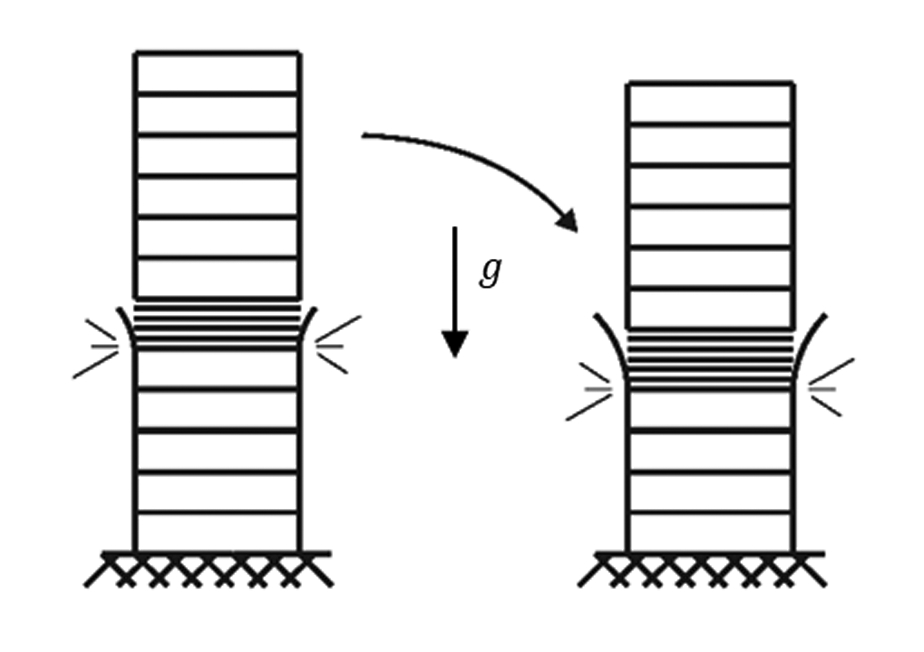 기둥이 붕괴되자 그 위의 건물 전체가 충돌 지점 아래의 첫 번째 온전한 층으로 무너져 내렸다. 붕괴 지점 아래의 온전한 층을 지지하는 연결부의 수직 지지력은 하중이 점진적으로 가해지는 경우 11개 층의 추가 하중을 견딜 수 있었지만, 갑자기 가해지는 경우에는 6개 층의 추가 하중만 견딜 수 있었다. 각 세계 무역 센터(WTC) 타워에서 붕괴 시작 추정 층 위에 6개 층 이상이 있었기 때문에(WTC 1에서는 12개 층, WTC 2에서는 29개 층), 붕괴 시작 지점 아래의 층은 건물 상층부에서 갑자기 가해지는 중력 하중에 저항할 수 없었다.[64]