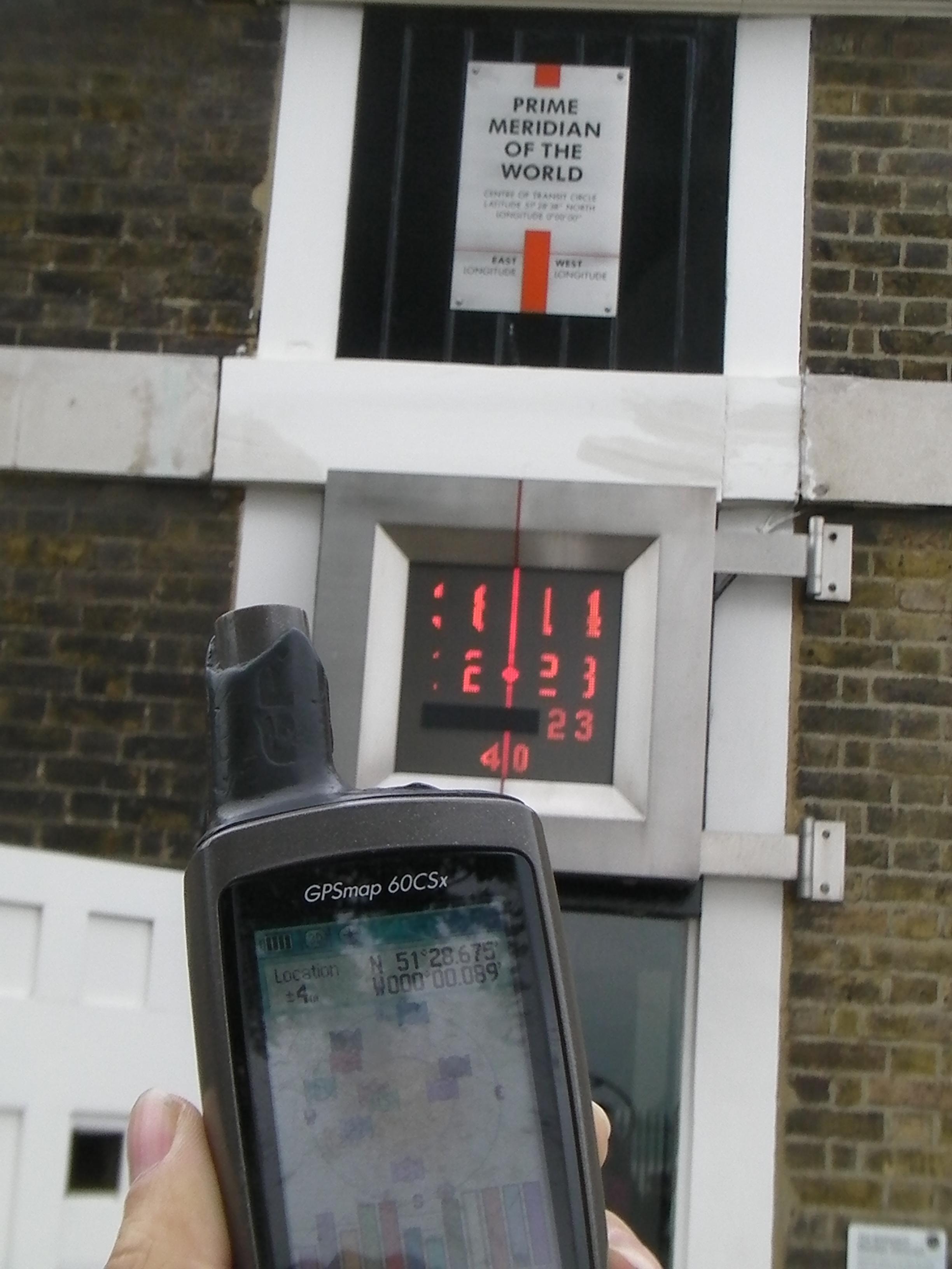 그리니치 천문대의 휴대용 GPS 수신기, 그리니치 자오선이 WGS 84 데이터(IERS 기준 자오선)에서 서쪽으로 0.089 (또는 5.34 )임을 나타낸다.