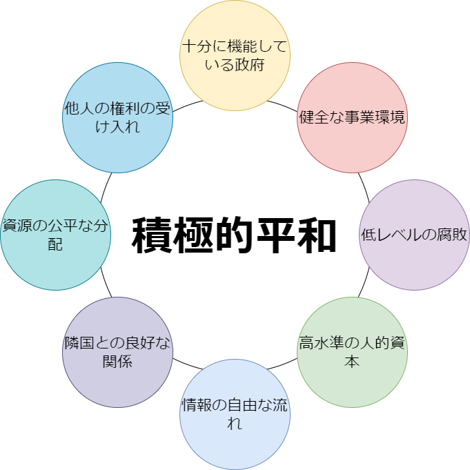 2022년 경제평화연구소는 “긍정적 평화”로 이어지는 8가지 요소를 다음과 같이 재정의했다.[47][48]