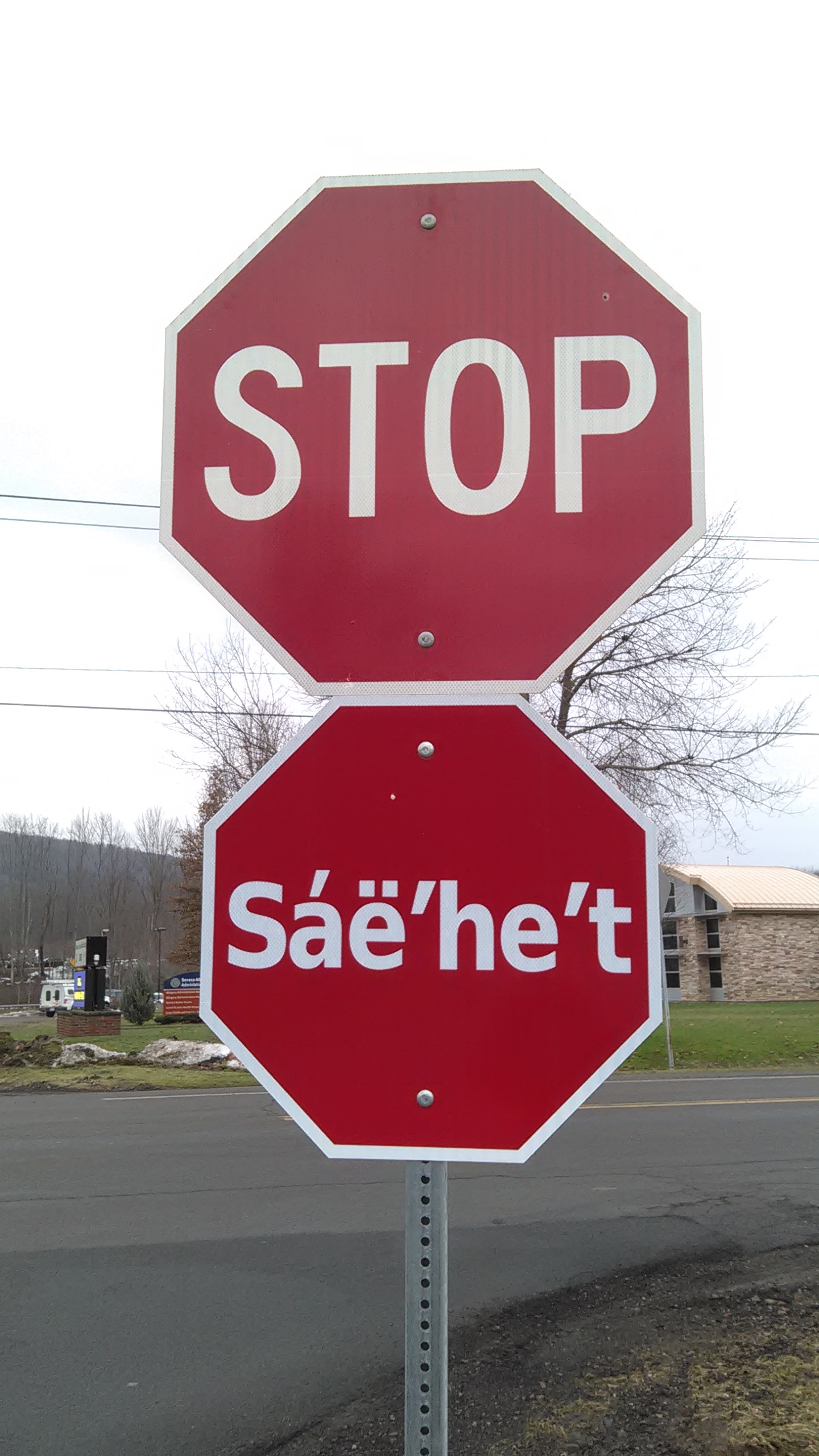 정지 표지판 및 속도 제한 표지판과 같은 이중 언어 도로 표지판이 짐머슨타운의 세네카 수도에 설치되었으며, 2016년에 세워졌다. 이전에 86번 주간 고속도로의 업그레이드 과정에서 앨러게니 인디언 보호구역 내의 타운십 이름이 Comic Sans로 고속도로를 따라 세네카어로 표시되었다.