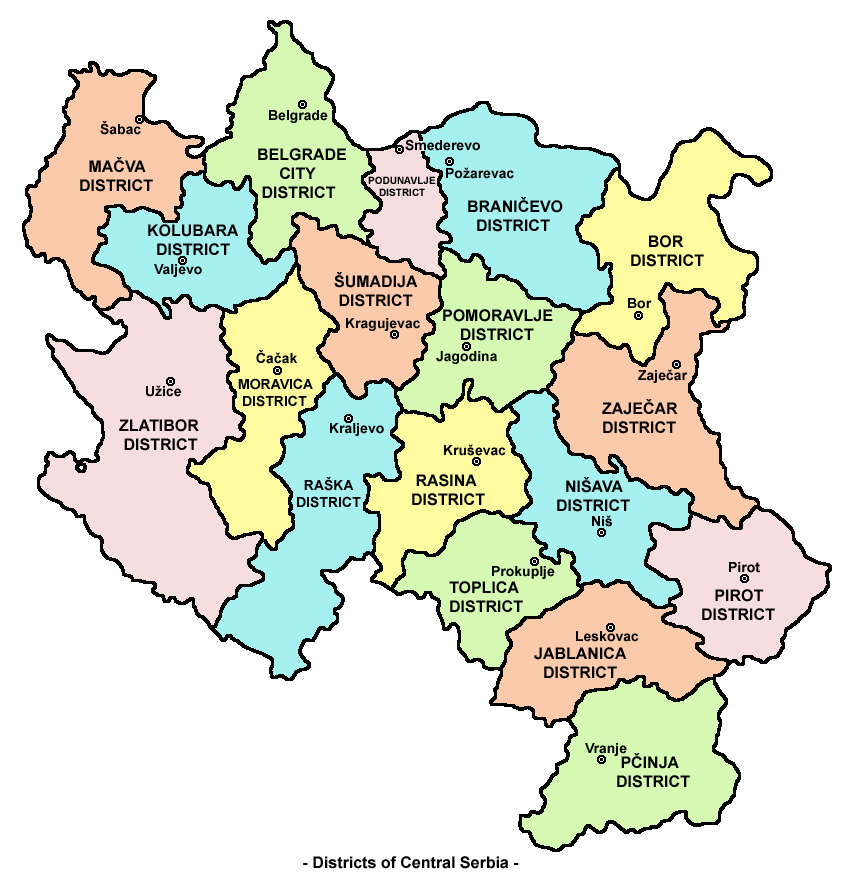 중앙세르비아에는 17개의 구가 있다. 각 구의 정보는 아래 표와 같다.