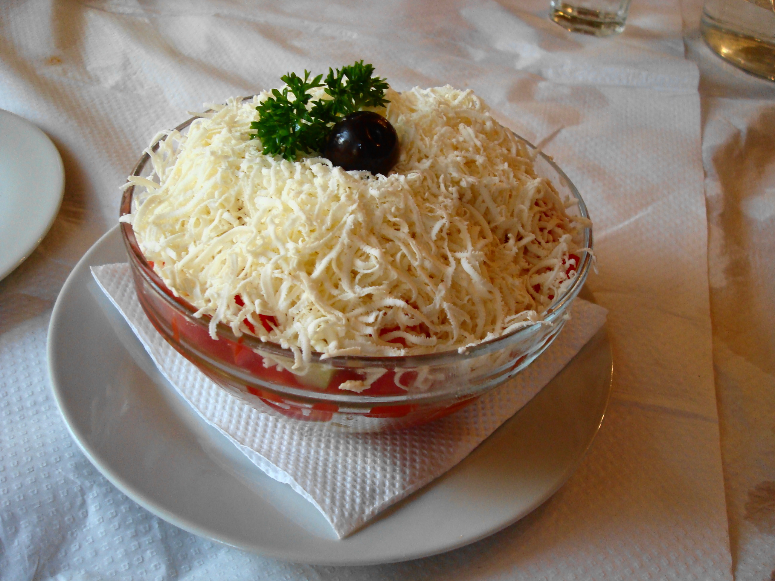 그르치카 살라타(Grčka salata) | Грчка салата | Grčka salata | 잘게 썬 토마토, 오이, 양파에 올리브와 페타 치즈를 얹고 올리브 오일로 드레싱한다. 원래는 그리스에서 유래되었지만, 세르비아에서도 매우 인기가 있다. ![]() |