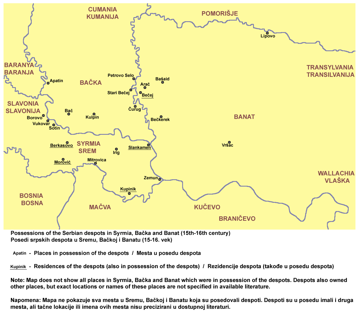 1404년 헝가리 왕 지기스문드는 시르미아, 바나트, 바치카의 일부를 세르비아 전제공 스테판 라자레비치에게 통치를 위해 빌려주었고, 이후 조르제 브란코비치가 계승했다. 오스만 제국이 1459년 세르비아 전제공국을 정복한 후, 헝가리 통치자들은 망명한 브란코비치 가문에게 전제공의 지위를 갱신했고, 이후 베리슬라비치 그바르스키 귀족 가문에게로 이어져 오스만 정복 전까지 시르미아의 대부분을 계속 통치했지만, 영토는 이론적으로 중세 헝가리 왕국의 행정 하에 있었다. 전제공들의 거처는 쿠피니크 (현대 쿠피노보)였다. 브란코비치 왕조 출신 전제공들은 부크 그르구레비치-브란코비치 (1471–1485), 조르제 브란코비치 (1486–1496), 요반 브란코비치 (1496–1502)이다.