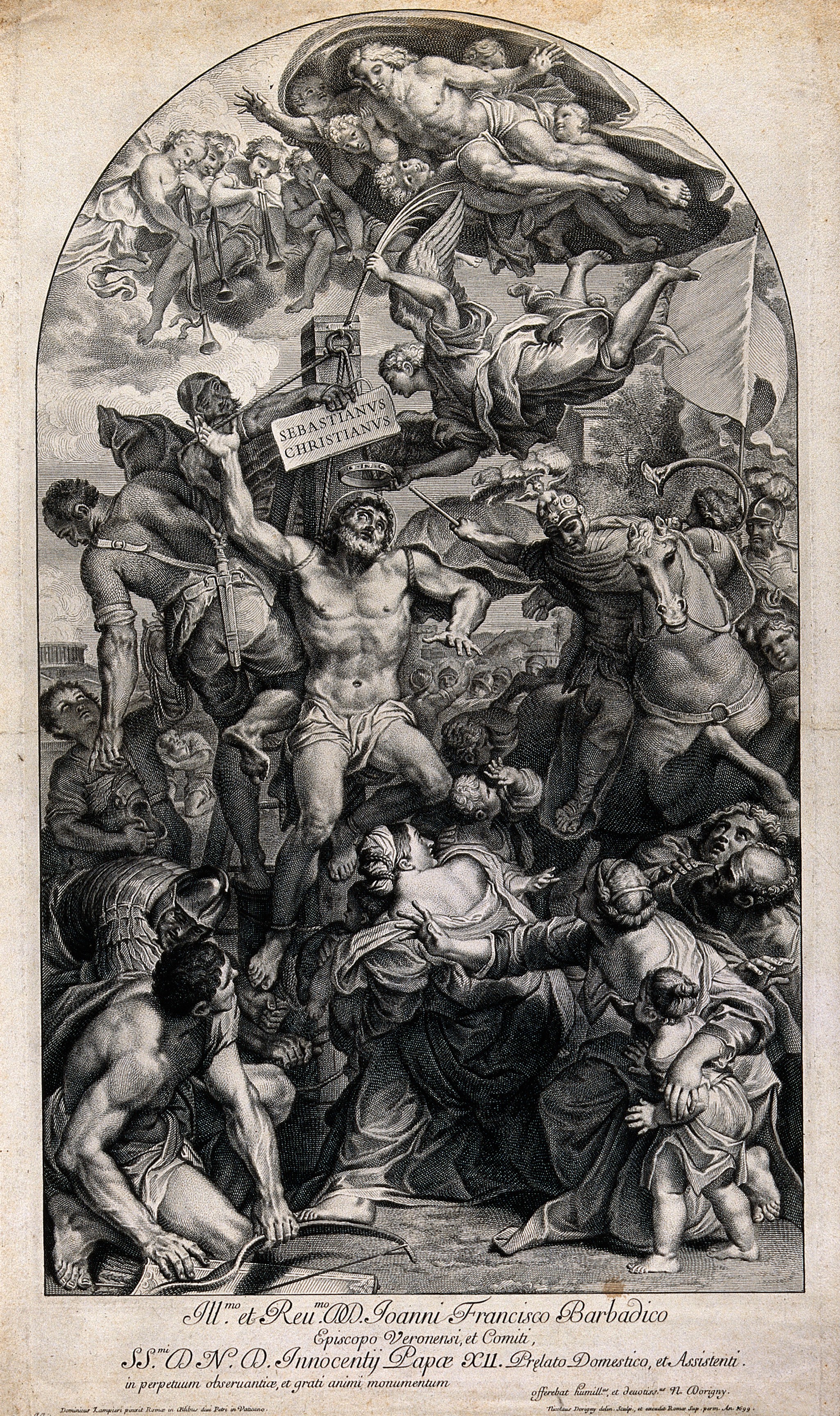성 세바스티아누스가 페스트 방어자라는 믿음은 중세 시대에 그의 명성에 추가되었으며, 이는 후기 중세 시대에 그가 크게 중요해진 주된 이유이다.[19] 화살 맞은 순교자와 페스트의 연관성은 직관적이지 않지만, 세바스티아누스가 "첫 번째 순교"(또는 "사기타티오")에서 회복한 사례는 화살 상처가 림프절 비대인 선페스트 증상과 유사할 수 있다는 점에서 관련이 있었다. 몰라누스는 "화살 상처는 우리에게 자비를 구하고, 병의 증상은 지나가는 사람에게 연민을 구한다"고 말했다.[20]