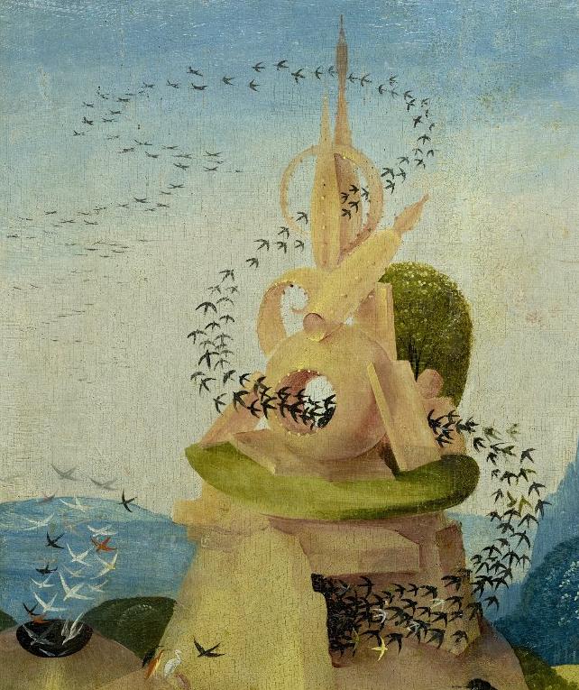 그 오른쪽에는 돌고래 꼬리를 가진 기사가 날개 달린 물고기를 타고 항해한다. 기사의 꼬리는 뒤로 말려서 그의 머리 뒤쪽에 닿는데, 영원성의 일반적인 상징인 우로보로스(자신의 꼬리를 무는 뱀)를 참조한다. 패널의 오른쪽 바로 옆에는 날개 달린 청년이 위로 날아오르며 손에 물고기를, 등에는 매를 들고 있다.[40] 벨팅에 따르면, 이러한 구절에서 보쉬의 "상상력은 승리한다... 그의 시각적 구문의 모순은 내용의 수수께끼조차도 능가하여 그림이 예술이 되는 자유의 새로운 차원을 열어준다."[15] 프랭거는 배경 상단에 대한 그의 장에 "천국으로의 승천"이라는 제목을 붙였고, 공중에 떠 있는 인물들은 "위에 있는 것"과 "아래에 있는 것"을 연결하는 것으로 의도되었을 가능성이 높다고 썼으며, 마찬가지로 왼쪽과 오른쪽 패널은 "과거의 것"과 "미래의 것"을 나타낸다.[41]