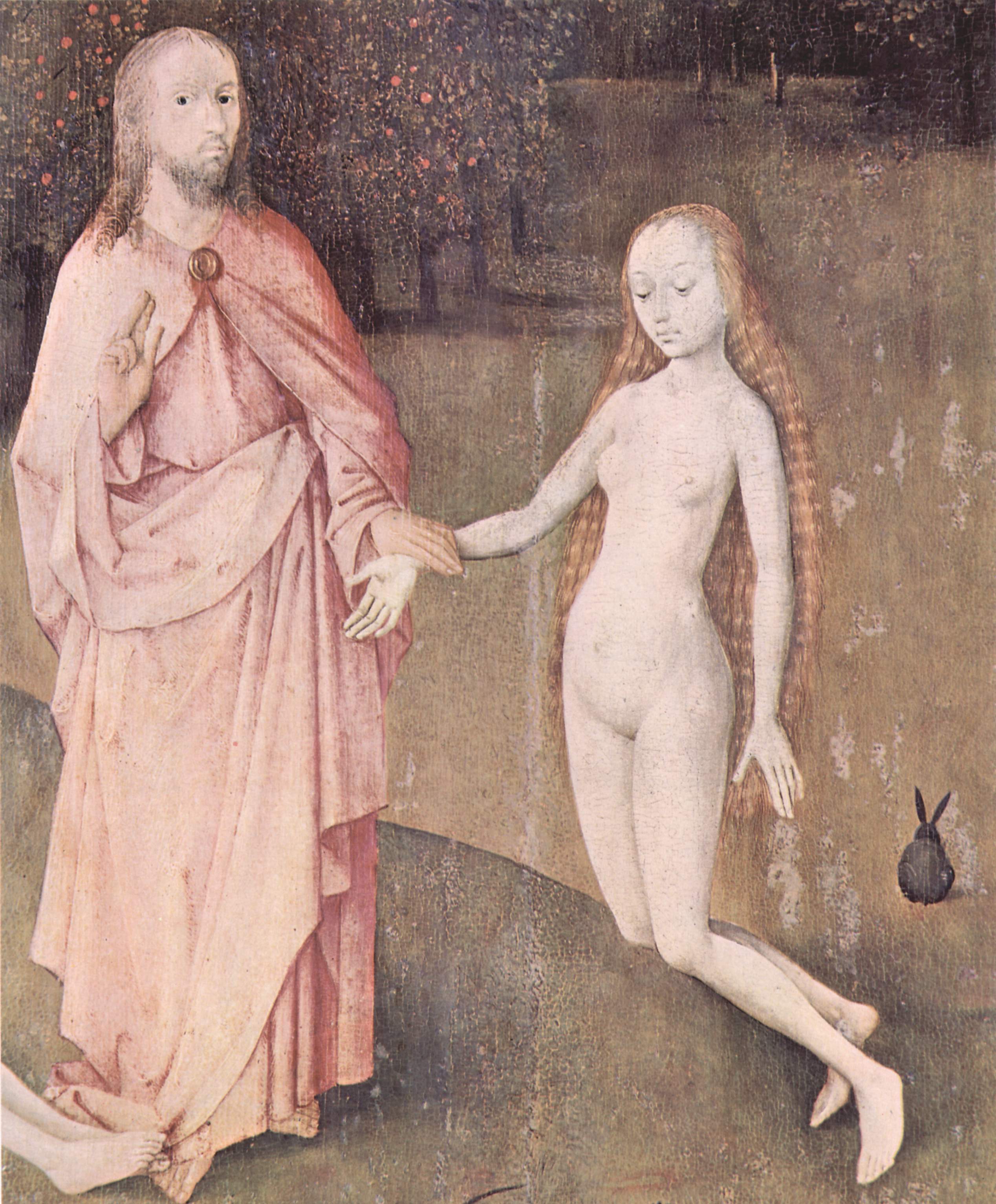 이브 뒤편에서는 다산을 상징하는 토끼들이 풀밭에서 놀고 있으며, 맞은편의 용혈수는 영생을 나타내는 것으로 여겨진다.[21] 배경에는 기린, 코끼리에 올라탄 원숭이, 그리고 사냥감을 죽이고 잡아먹으려는 사자 등 당시 유럽인들에게 이국적이었을 여러 동물들이 등장한다. 전경에서는 땅의 큰 구멍에서 새와 날개 달린 동물들이 나오는데, 그중 일부는 사실적이고 일부는 환상적이다. 15세기 중반 인본주의 학자 치리아코 안코나의 여행기가 보쉬가 이러한 이국적인 동물들을 접하게 된 원천이었다고 한다.[22]