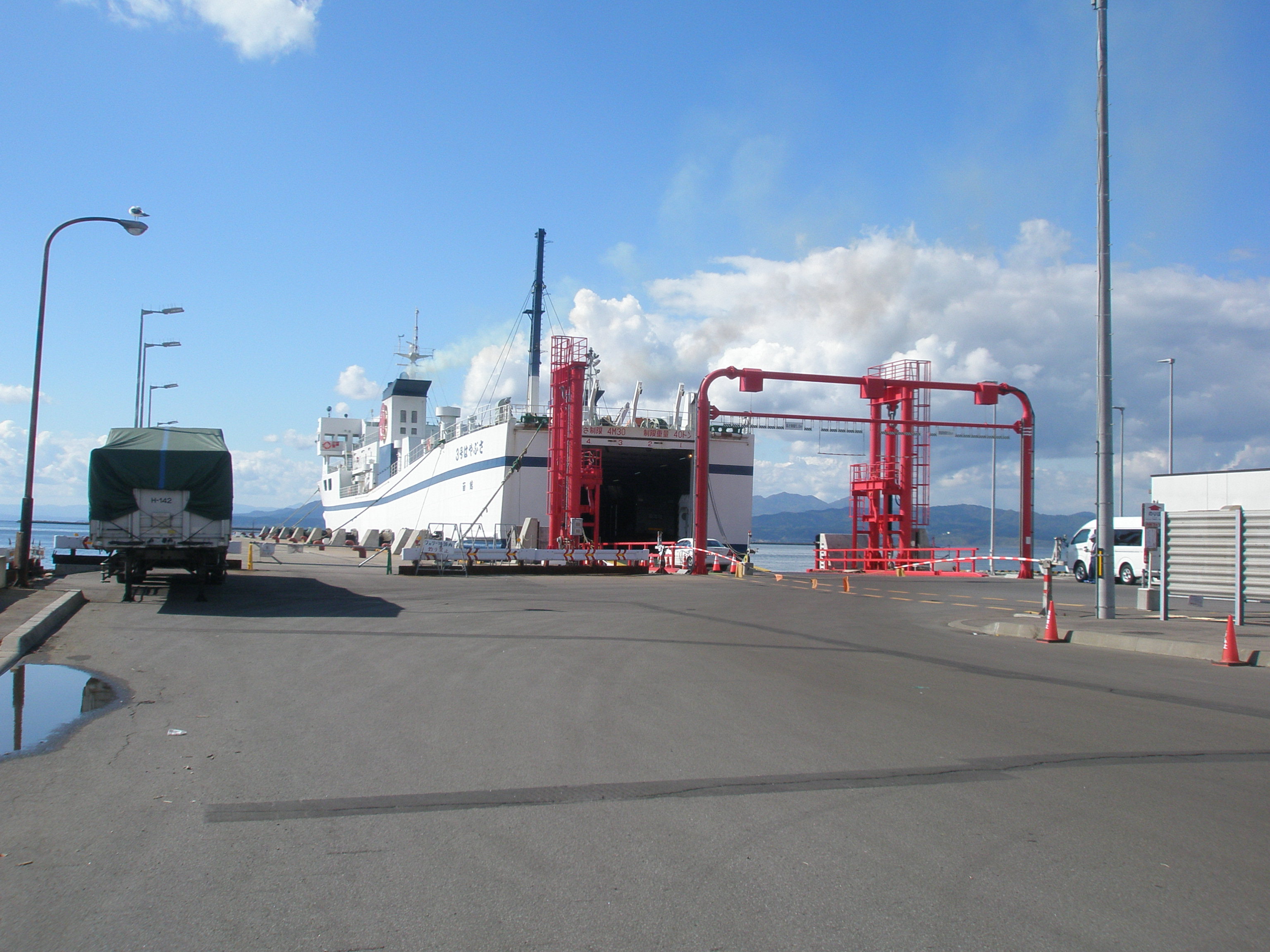 하코다테 항은 이전에 일반 화물선용 안벽을 공용하고, 선미만 접안하는 종착 계류를 하고 있었지만, 닻을 사용한 접안이기 때문에 작업에 시간이 걸리고, 안벽의 수심이 5.5m로 선박의 대형화에 대응할 수 없었으며, 안벽이 내진화되어 있지 않은 등의 문제가 있었다. 접안 작업 시간 단축을 통한 수송 효율 향상, 선박 대형화 대응, 재해 시 해상 긴급 물자 수송 확보를 위해 "하코다테항 북부두 지역 복합 일관 수송 터미널 정비 사업"으로 약 40억엔을 들여 횡착 접안이 가능한 내진 강화 안벽(수심 6.5m, 190m×1バース)이 정비되었다. 2014년 3월 28일에 새로운 부두 사용을 시작하고, 대형화된 신조선 하야부사(4대)가 취항하여 터미널 건물도 신축 이전했다.[7]