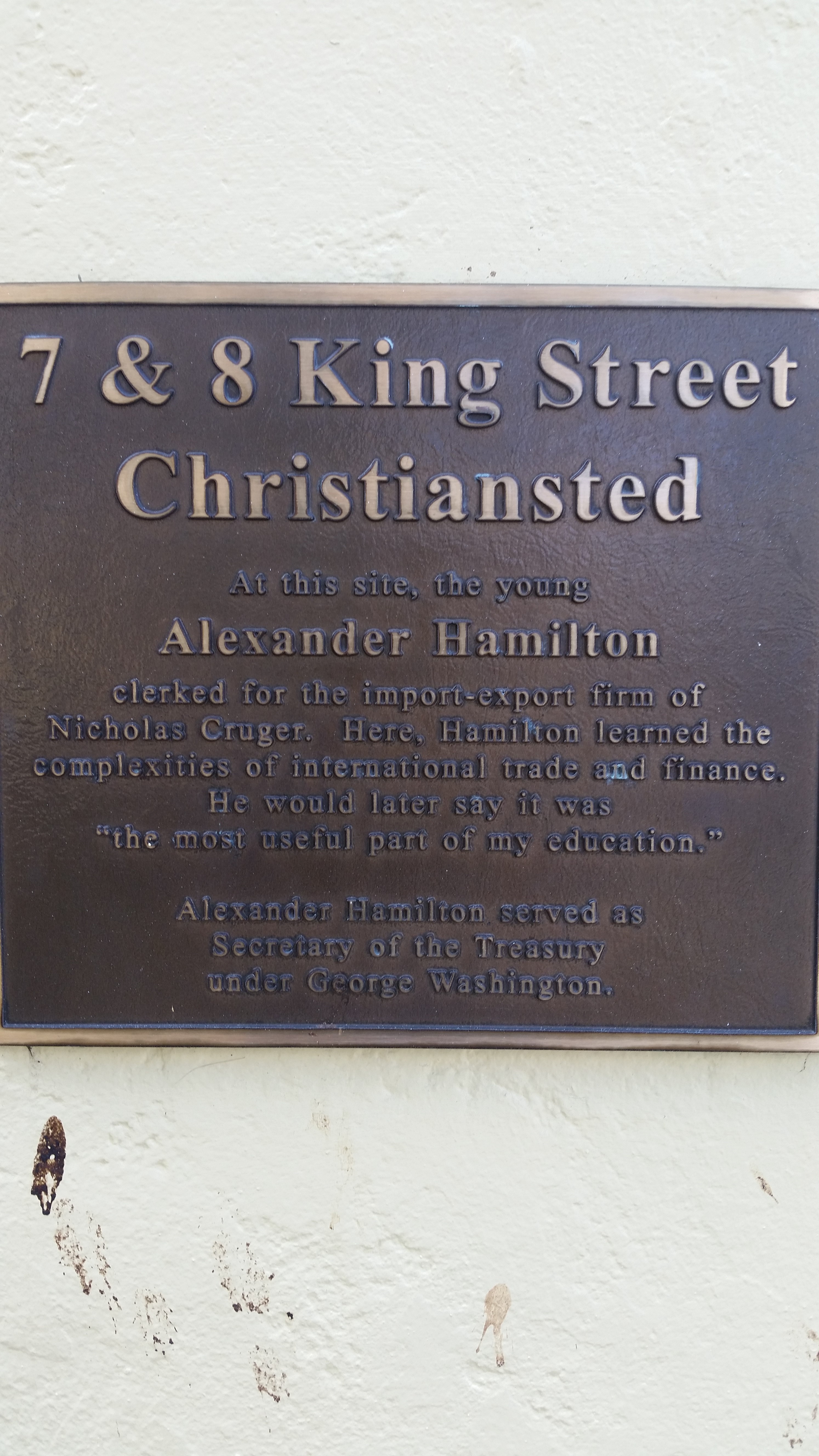 미래의 미국 혁명 지도자 알렉산더 해밀턴과 그의 형제는 1765년 어머니 레이첼 포세트가 섬으로 돌아온 후 세인트크로이의 크리스찬스테드에서 함께 살았다. 그들의 거주지는 34 컴퍼니 가의 2층에 있었고, 레이첼은 1층을 식료품 판매점으로 사용했다. 2년 안에 해밀턴은 아버지 제임스 해밀턴을 버림으로써 잃었고, 어머니는 사망했다. 섬의 공식 문서, 즉 삼촌의 1768년 유언 검인 법원 증언은 알렉산더의 나이를 13세로 밝혔다. 1769년까지 해밀턴의 사촌, 고모, 삼촌, 할머니도 사망했다. 알렉산더의 형제 제임스는 목수 견습생이 되었고, 알렉산더는 킹 스트리트의 상인 토마스 스티븐스의 후견인이 되었다. 해밀턴은 곧 킹 가와 킹스 크로스 스트리트 교차로에서 비크만과 크루거의 수출입 사업에서 사무원으로 일했다. 1772년 지역 사업가들이 해밀턴의 뉴욕에서의 추가 교육을 지원했다.[12]