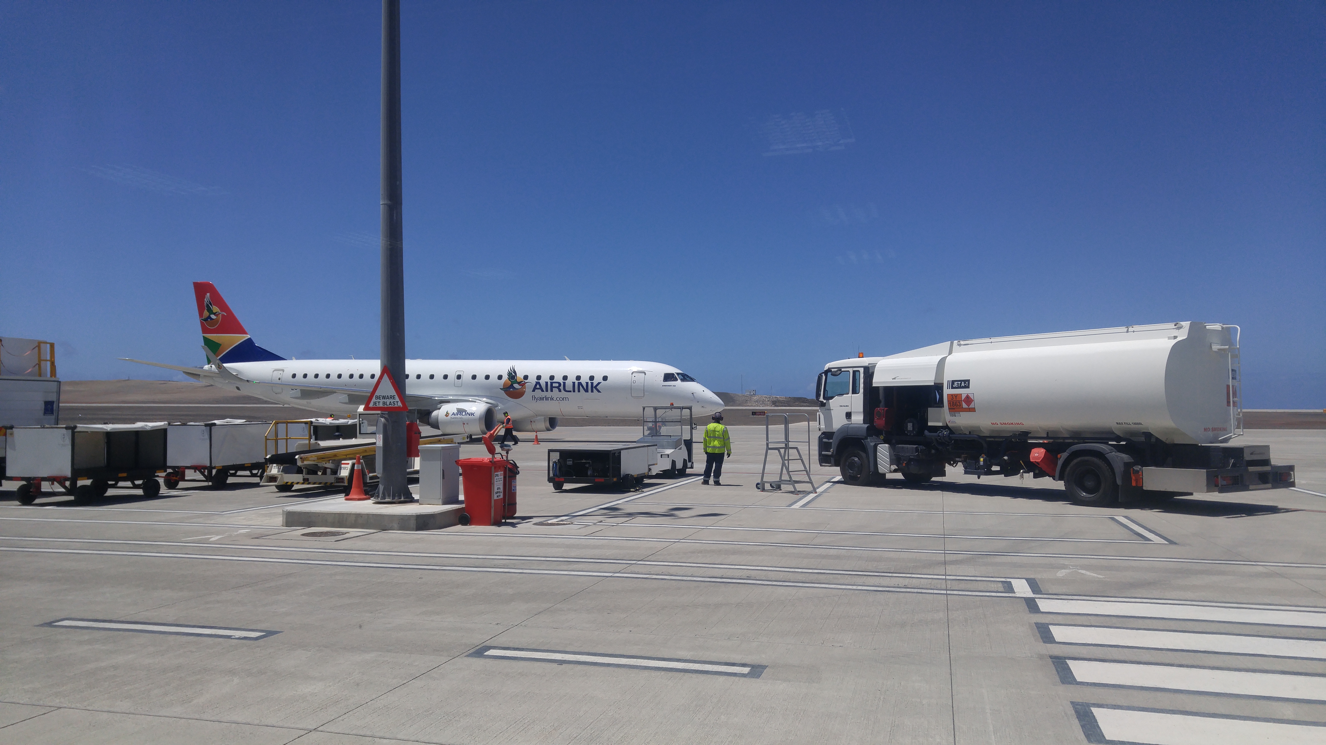 2017년 5월 3일, 유료 승객을 태운 최초의 상업 전세 항공편이 운항되었다. SA 에어링크는 Avro RJ85 항공기를 사용하여 케이프타운에서 항공편을 운항했으며, 60명의 승객이 탑승했다. 세인트헬레나로 갈 때는 모사메데스(앙골라)에서, 케이프타운으로 갈 때는 빈트후크에서 연료를 보급했다.[80][81] RMS ''세인트헬레나''의 기술적 문제로 인해 섬은 최소 2개월 동안 고립되었으므로 항공편이 필요했다.[82]