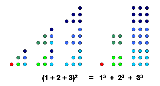 예를 들어, 처음 5개의 세제곱의 합은 5번째 삼각수의 제곱이다.