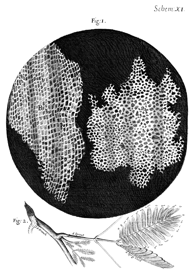 현미경 기술이 발전하면서 세포를 발견할 수 있게 되었다. 1665년 로버트 훅은 《마이크로그래피아》에 자신이 관찰한 60여 가지 생물 그림을 수록했는데,[28] 그중 하나가 코르크 병마개를 얇게 잘라 관찰한 것이다. 훅은 코르크 조직에서 보이는 격자를 "세포(cell)"라고 불렀는데, 이는 라틴어 'cella'에서 유래한 작은 방을 뜻하는 말이었다. 그러나 훅은 자신이 관찰한 구조의 기능을 알지 못했고,[30] 세포벽만 남은 빈 공간을 세포라고 생각했다. 당시 현미경 배율로는 세포핵이나 다른 세포소기관을 관찰할 수 없었기 때문에, 훅은 세포가 살아있다고 생각하지 못했다.[31]