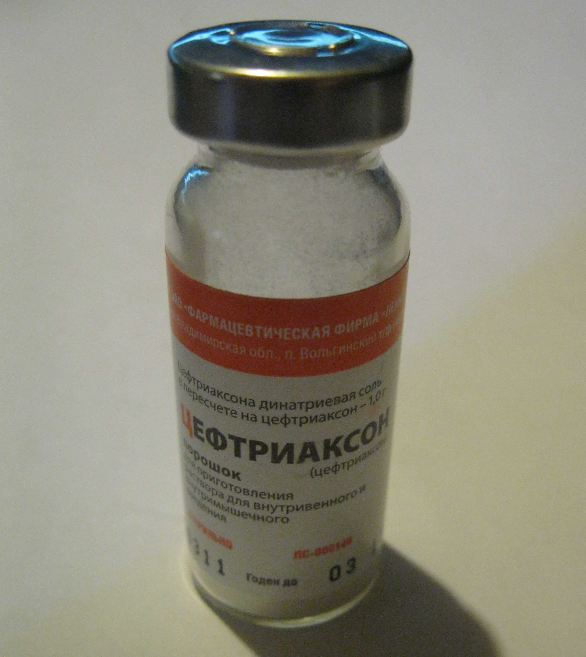 세프트리악손은 정맥 주사 또는 근육 주사로 투여하는 항생제로, [47] 다양한 세균 감염증 치료에 사용된다.