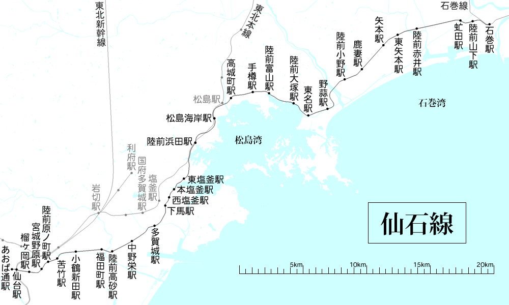 도호쿠 본선은 간토 지방에서 아오모리현까지 이어지는 주요 철도 간선으로, 도쿄와 도호쿠 지방을 연결하며 현재는 수도권 통근 및 지역 생활 노선으로 기능한다. - 센다이만 - 이시노마키선