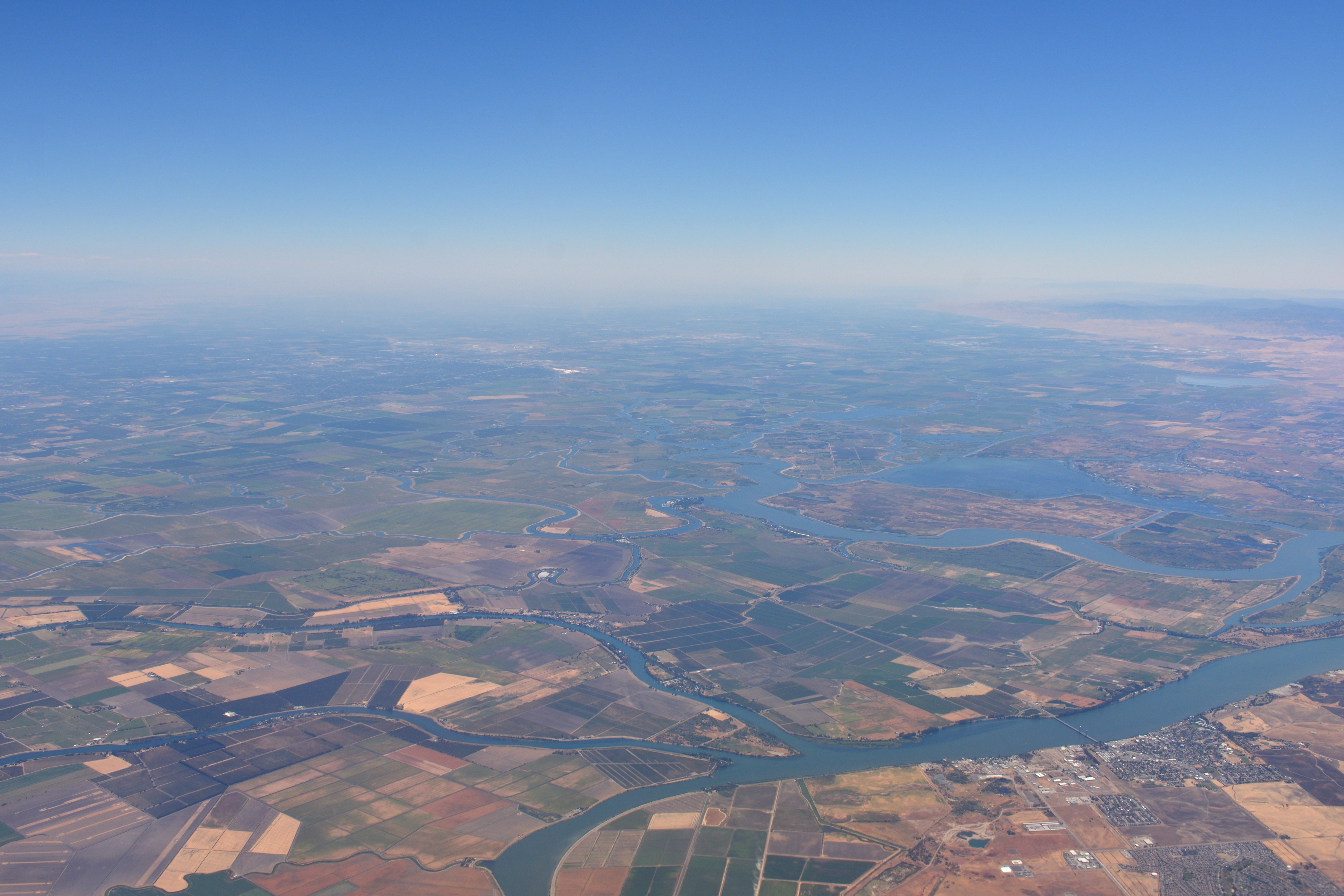 센트럴 밸리 강들은 주로 농업에 사용되는 섬 주변을 맴도는 습지 채널, 분기류 및 슬루의 네트워크인 새크라멘토-샌와킨 삼각주에서 합류한다. 그곳에서 강들은 조수와 합류하여 수이순 만, 샌파블로 만, 상부 샌프란시스코 만을 거쳐 마지막으로 골든 게이트를 통과한 후 바다에 이른다. 많은 섬들은 격렬한 농업으로 인해 해수면보다 낮으며 홍수의 위험이 높아, 특히 밸리에서 유입되는 담수가 너무 적을 때 염수가 삼각주로 쇄도할 수 있다.[33]