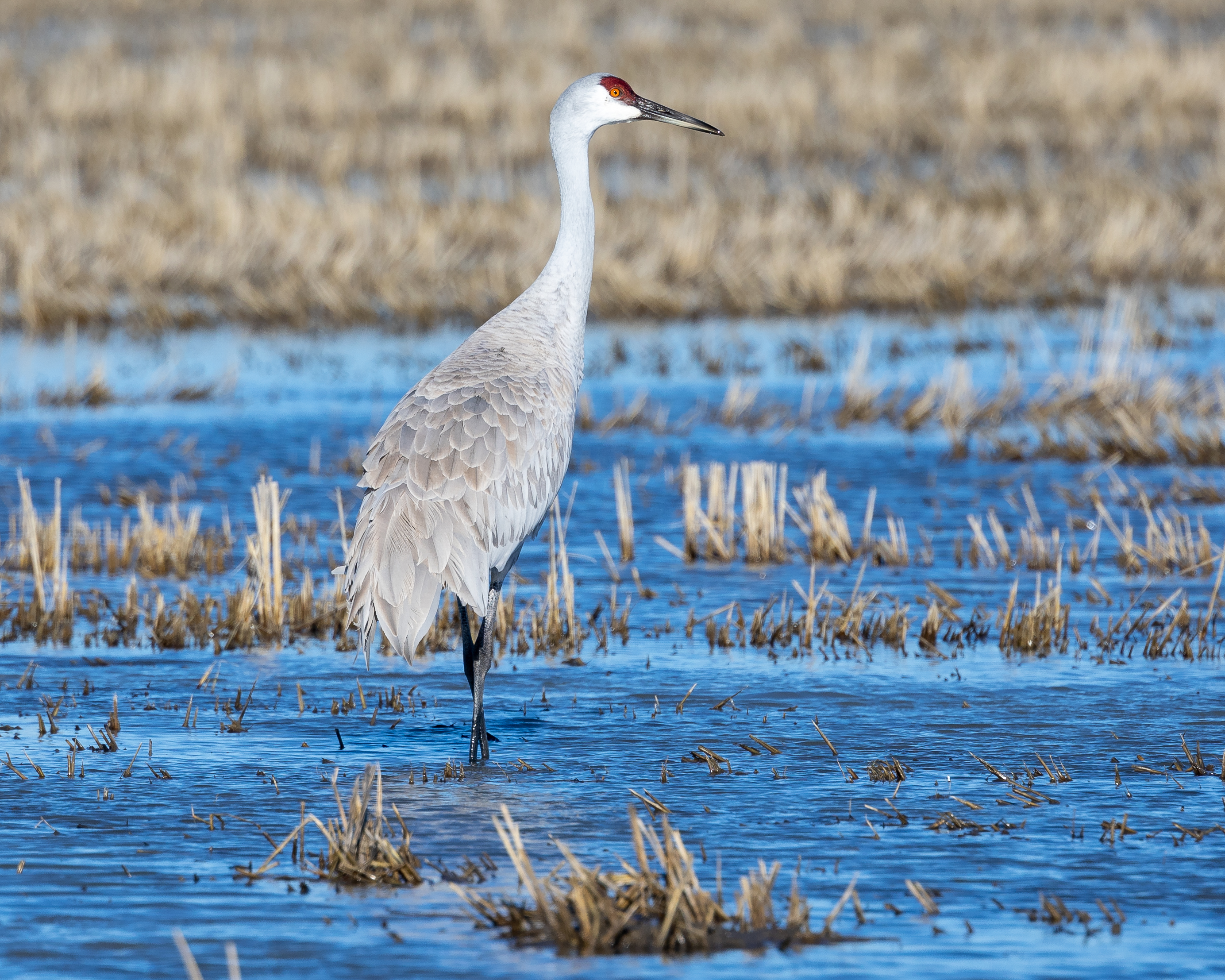 샌드힐 크레인(''Antigone canadensis'')이 캘리포니아주 버트 카운티의 홍수 지역에 있다. 센트럴 밸리의 겨울 서식지에서 샌드힐 크레인은 주로 옥수수, 쌀, 밀밭에서 버려진 곡물을 찾아 먹는다.