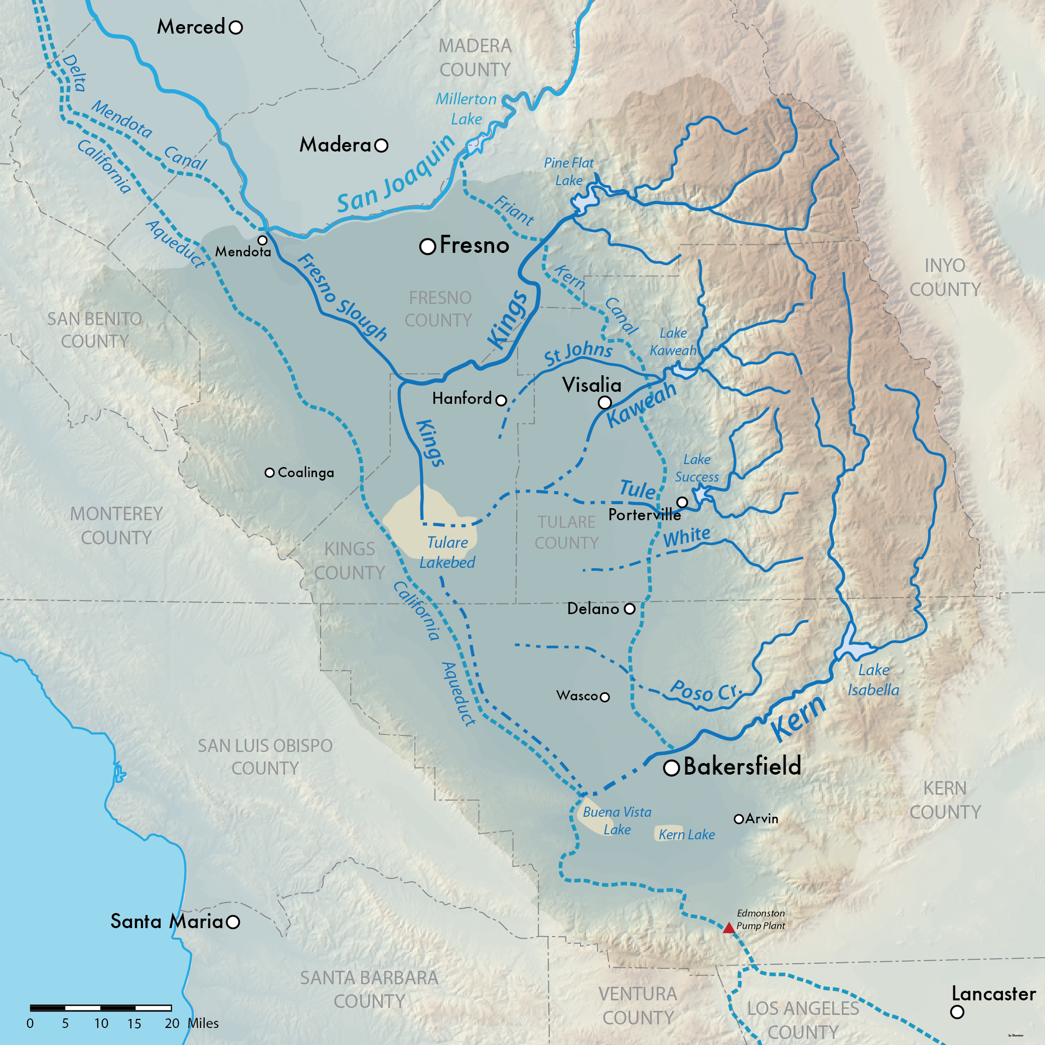 샌와킨 밸리의 남쪽 부분에서는 킹스 강의 선상지와 코스트 레인지(Coast Ranges)의 다른 하천에서 유입된 물줄기가 경계를 만들었다. 센트럴 밸리의 건조한 툴레 분지는 킹스 강, 카웨아 강, 툴레 강, 컨 강 등 4개의 주요 시에라 네바다 강에서 물을 공급받는다. 이 분지는 일반적으로 내륙 유역이며, 예전에는 눈이 녹을 때 물이 채워져 샌와킨 강으로 흘러 들어갔다. 툴레 호수라고 불리며, 일반적으로 물을 공급하는 강이 농업 목적으로 방향이 바뀌면서 말라 있다.[32]