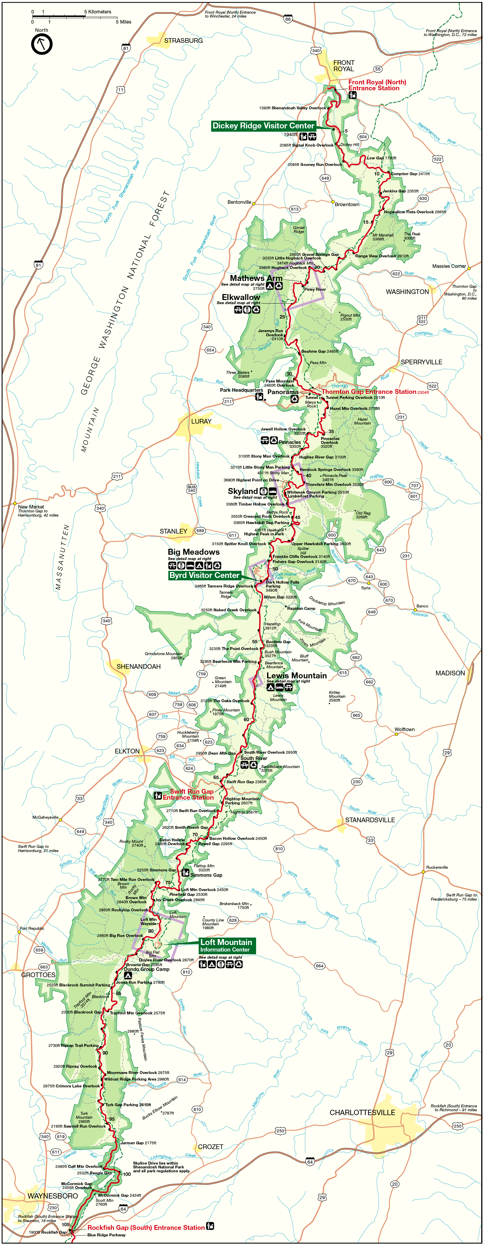스카이라인 드라이브는 북동쪽의 프론트 로열 마을에서 시작하여 남서쪽의 웨인즈버러 시까지 이어지며, 총 길이는 169km에 달한다.