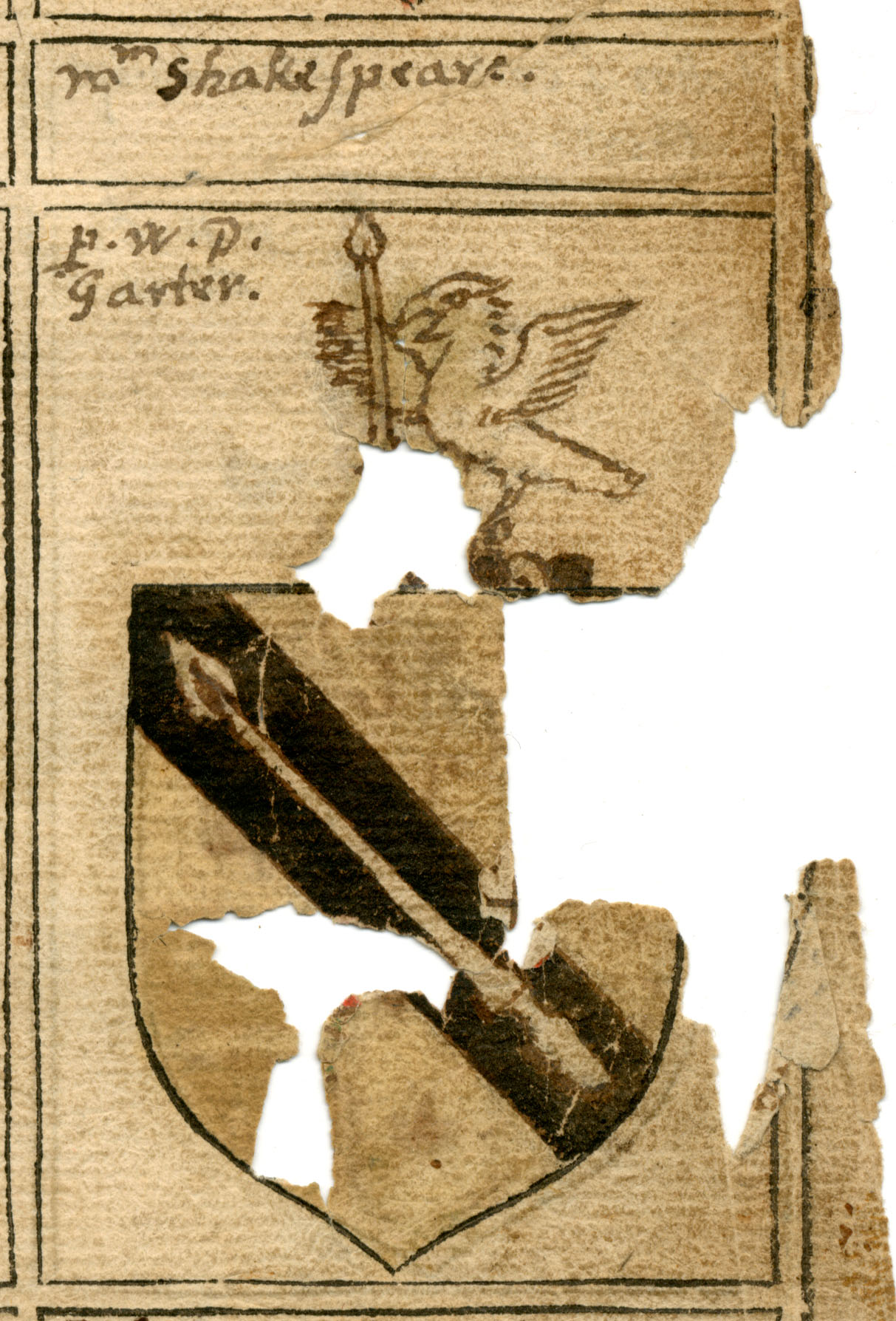 1602년, 랄프 브룩, 요크 헤럴드는 가터 문장관인 윌리엄 데딕 경이 23명의 부적격자를 젠트리로 승격시켰다고 비난했다.[102] 이들 중 한 명은 셰익스피어의 아버지였는데, 그는 34년 전에 문장을 신청했지만 1596년 아들의 성공을 기다려야 했다.[103] 브룩은 "가터가 지은 셰익스피어 선수"라는 캡션과 함께 셰익스피어 문장의 스케치를 포함시켰다.[104] 존 셰익스피어를 포함한 보조금은 데딕과 당시 최고의 고고학자인 클라렌스 문장관인 윌리엄 캠던에 의해 옹호되었다.[105] 1605년에 출판되었지만, 2년 전에 완성되었고 1604년 옥스퍼드 백작이 사망하기 전에 쓰여진 그의 ''영국에 관한 유물''에서 캠던은 셰익스피어를 "우리 시대의 가장 뛰어난 재능을 가진 사람들 중 한 명이며, 후세가 정당하게 존경할 수 있는 인물"이라고 칭했다.[106]