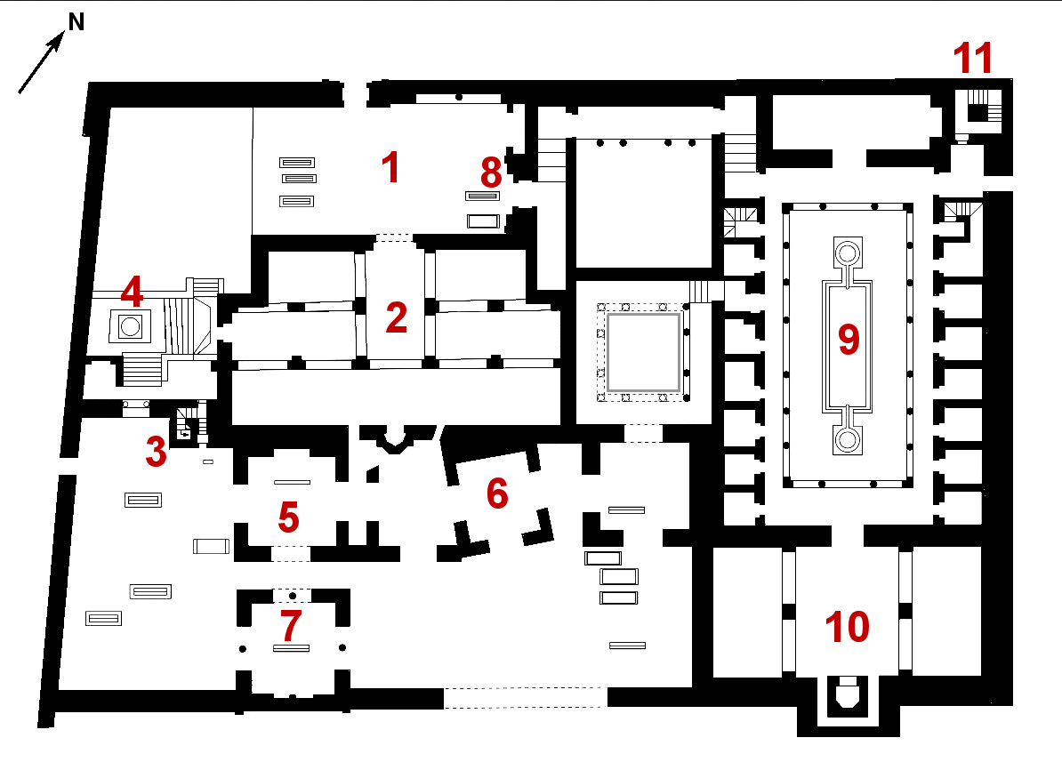 이 서쪽 지역의 다른 주요 건물은 ''카피톨리움'' 정반대편, 남쪽에 위치하며 마린 왕조 종교 단지의 경계벽 근처에 있다. 이 건물은 ''쿠리아''(''쿠리아 울피아'') 또는 바실리카로 잠정적으로 확인되었다. 그 건설은 인근의 ''카피톨리움''과 동시대에 이루어진 것으로 보인다. 이 건물은 약 32m x 19m의 직사각형 평면을 가지고 있다. 그 중심에는 내부 벽을 따라 틈새가 있는 큰 팔각형 구멍이 있으며, 이는 한때 건물의 지상 수준까지 확장되었던 지하 ''님파이움''에 해당한다.[8]