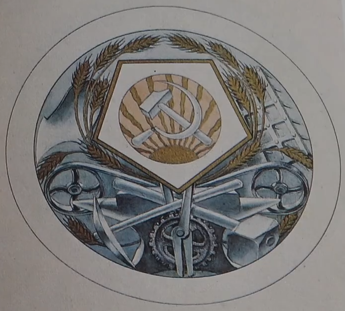 | 장식 | 15개 소비에트 공화국 언어로 쓰여진 표어가 있는 붉은 리본으로 묶인 밀 |