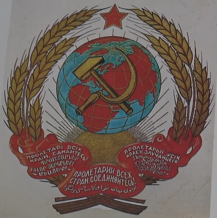 1936년 소련 헌법에 따르면, 소련은 11개의 공화국으로 구성되어, 11개 언어로 된 소련 국가 모토 비문을 담은 11개의 리본을 가지게 되었다. 카자흐어, 키르기스어, 투르크멘어, 우즈베크어가 추가되었다.