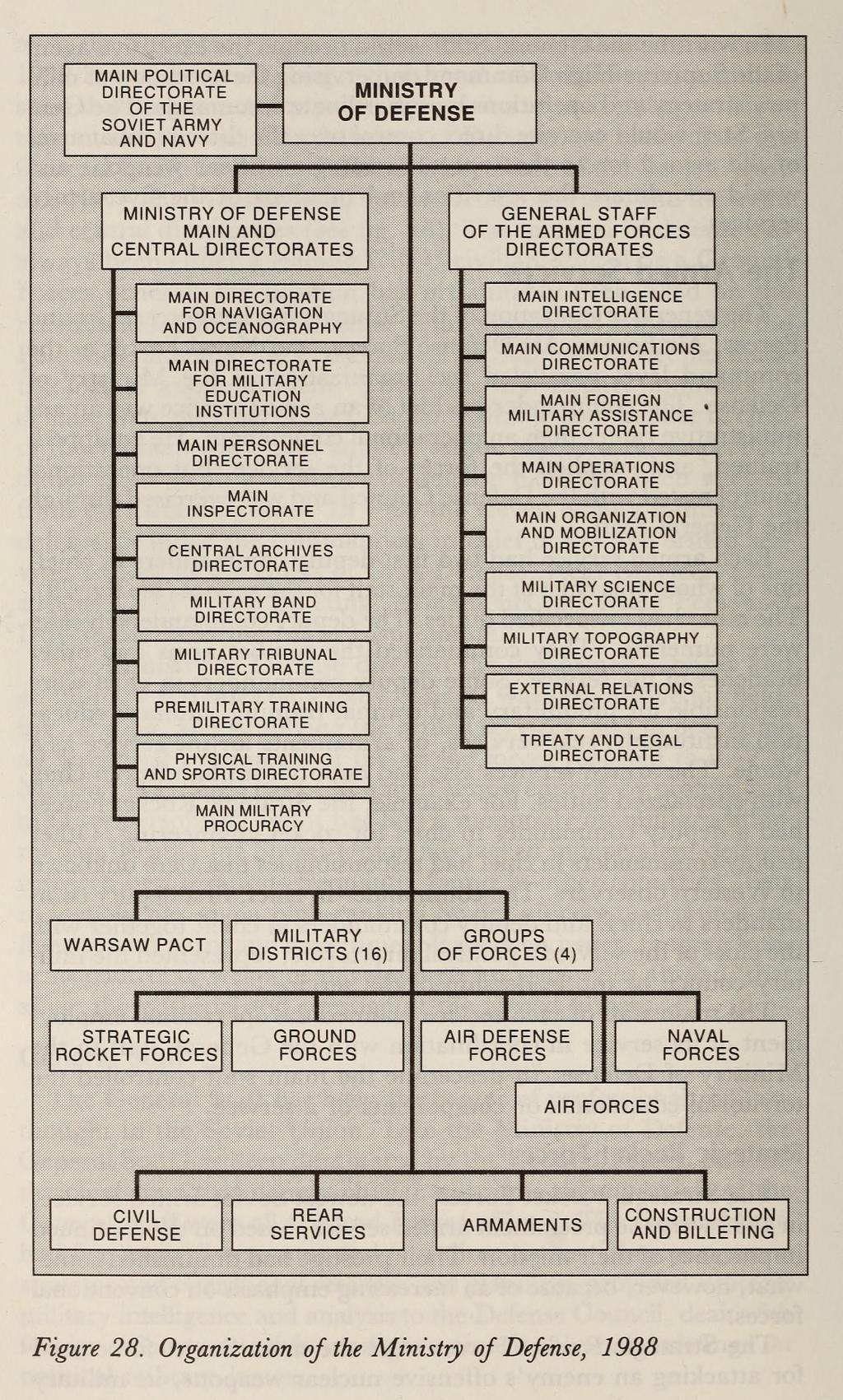 소련 국방부는 연합사(聯合司) 역할로, 기술적으로 소련 각료평의회와 러시아 최고 소비에트 및 소련 공산당 중앙위원회에 종속되었다. 그러나 1989년에는 대부분의 다른 부처보다 규모가 커서 그 활동에 대한 정당 감독 및 국가 참여를 위한 특별한 조치를 취하게 되었다. 국방부는 참모, 소련군의 주요 정치국, 5개 바르샤바 조약 기구국, 주요 및 중앙국으로 구성되었다.[7]