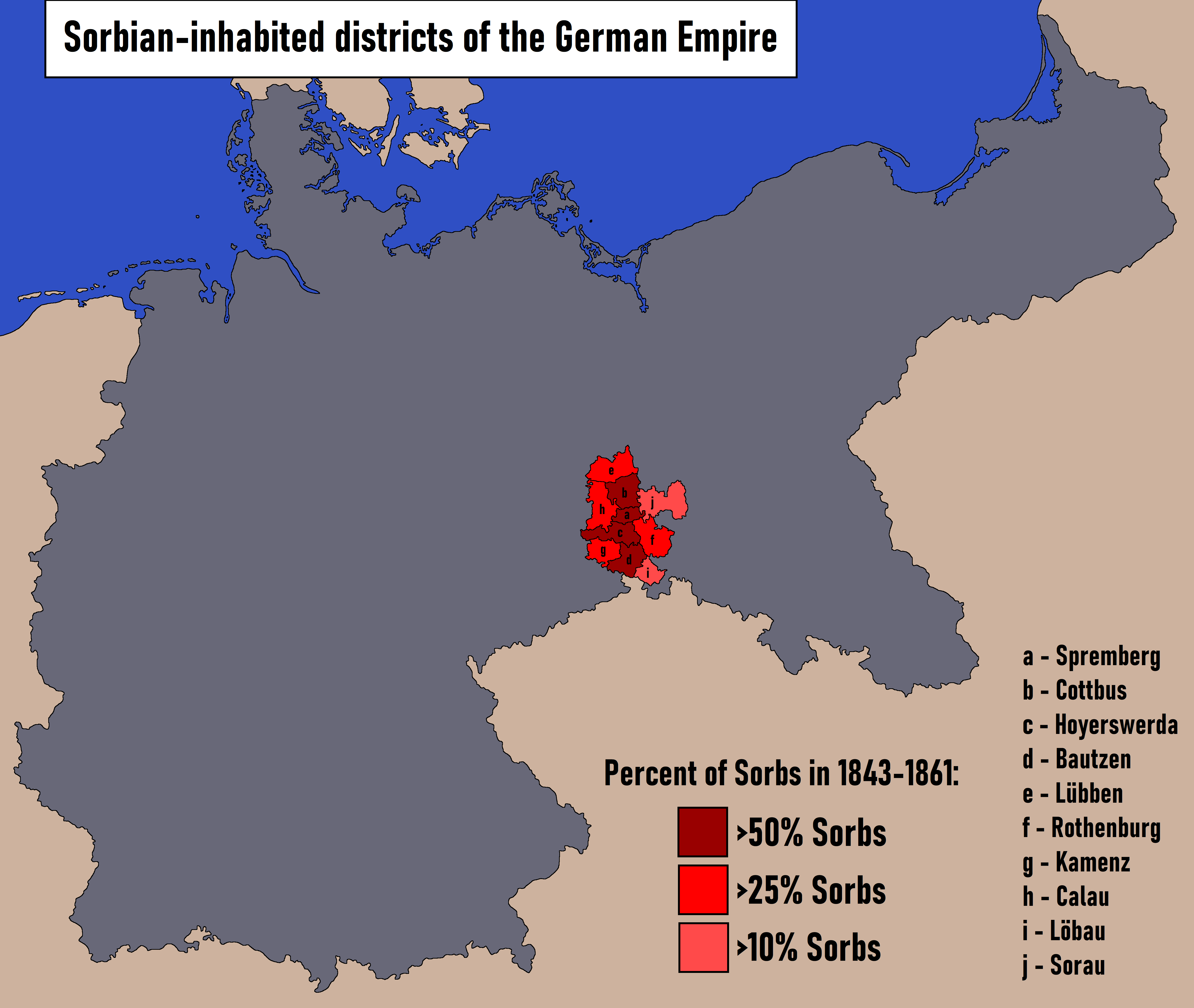 1871년부터 이 지역의 산업화와 독일인 이주가 시작되었고, 공식적인 독일화가 강화되었다. 19세기 내내 독일 통치하에서 소르브인들에 대한 박해는 점점 더 심해졌다. 슬라브인들은 게르만 민족보다 열등하다고 낙인찍혔고, 1875년에는 독일 학교에서 소르브어 사용이 금지되었다. 그 결과, 19세기 말까지 거의 모든 소르브인 인구가 이중 언어 사용자가 되었다.