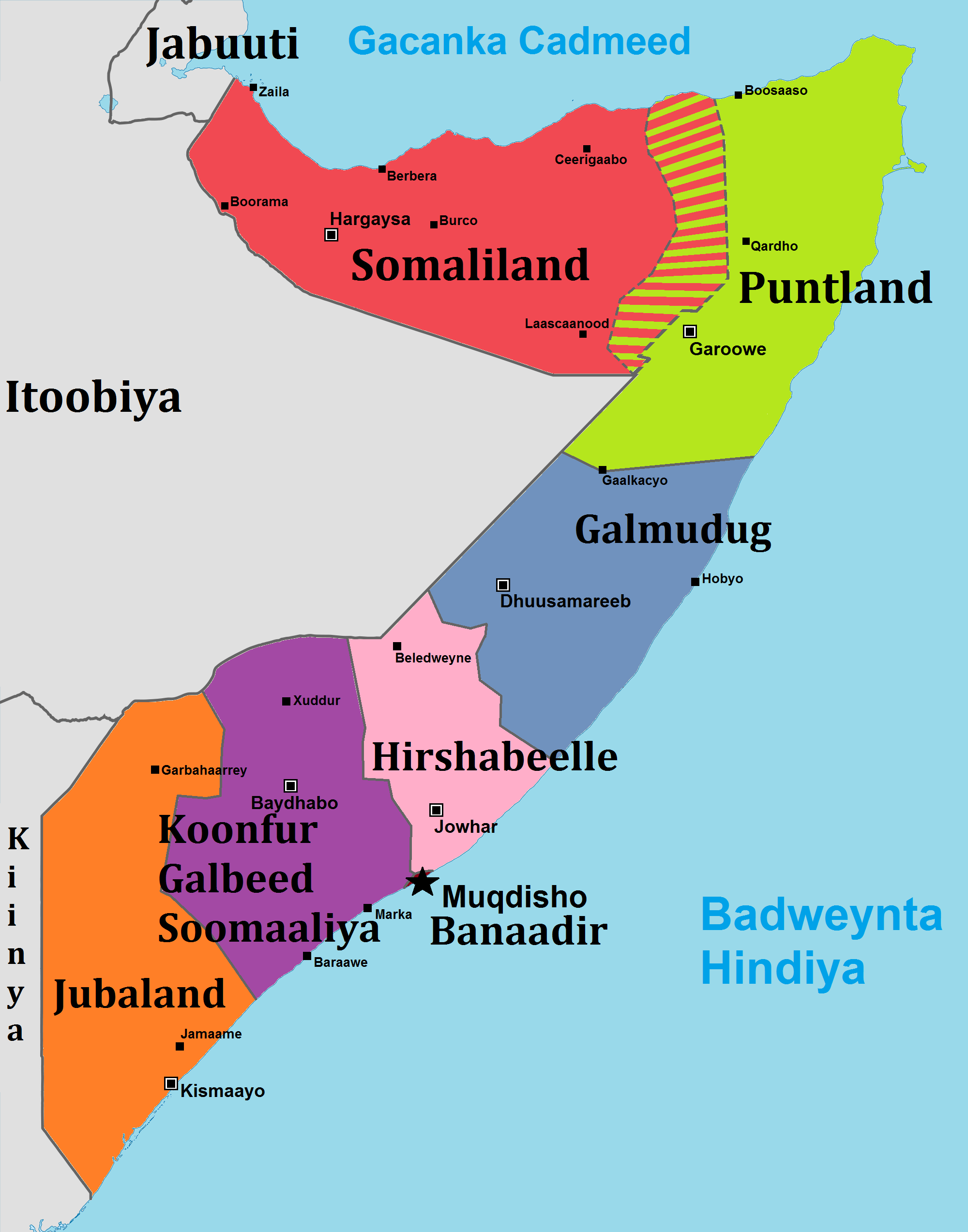 -- | -- | 갈무두그 소말리아국 | Dowlad Goboleedka Galmudug ee Soomaaliya ولاية جلمدج الصومال|윌라야트 잘무두즈 앗수말ar Galmudug State of Somalia | 두사마레브 | 아흐메드 압디 카리에 | 2006년 8월 14일 | 무두그(남부), 갈구두드 |